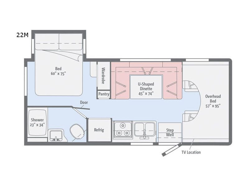 This Minnie Winnie class C motorhome has everything you need to enjoy a great time away from home! This unit features a slide out 60" x 75" bed, and all of the basic kitchen accommodations that make cooking and dining easy right from camp. Above the cab there is a 57" x 95" bed, plus the u-dinette also converts into a 45" x 74" bed. In the rear corner bathroom you will find a 23" x 34" shower plus a toilet and a sink. Get ready to set out on new adventures with this 22M Minnie Winnie! This unit is also available with a Ford E450 chassis which will change the axle and GRVW's. All specs. shown are with a Ford E350 chassis.