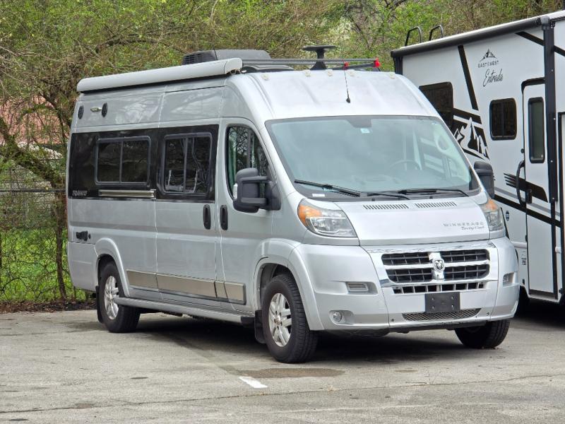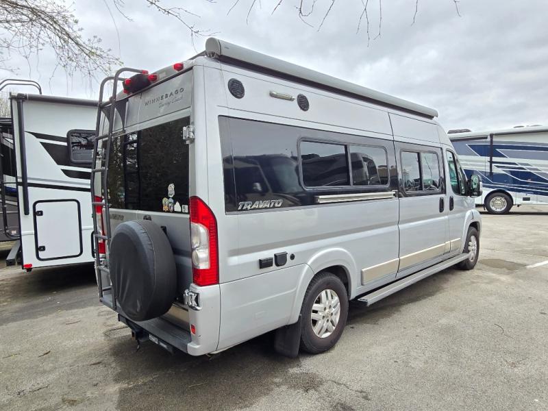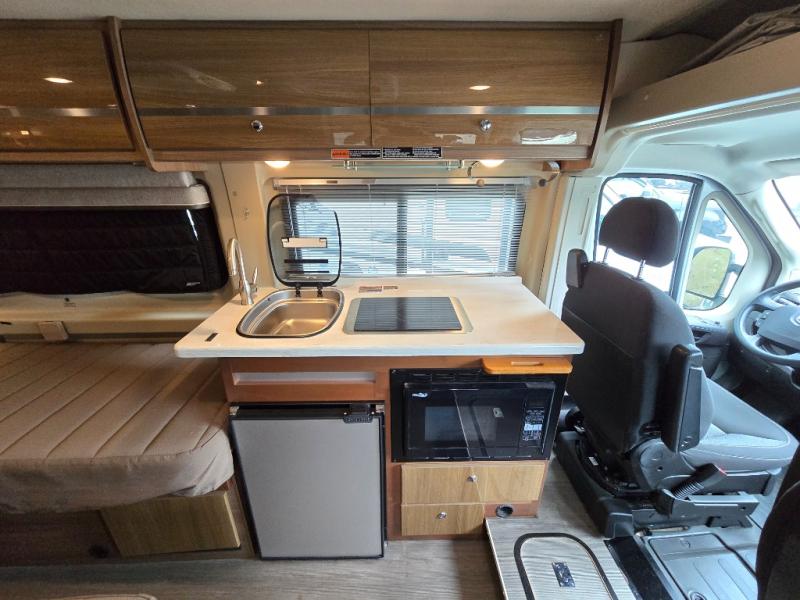 Get ready to go on more road trips and weekend excursions with a Travato class B motor home by Winnebago. You will find that these models feature a Ram ProMaster 280-hp, 3.6L V gas engine. Inside the cab there is a radio/GPS navigation/rearview monitor system plus front and cab window privacy panels. The 24" HDTV and coach stereo system w/AM/FM radio, Bluetooth, CD/DVD player allows you to watch a little TV a movie, or listen to your favorite music. The kitchen is not lacking on features here you will find Corian counter tops, a 2-burner range top with glass cover and heat shield where you can fix your favorite meals, plus there are cabinets and overhead storage throughout. What are you waiting for? Come start your next trip with a Travato!