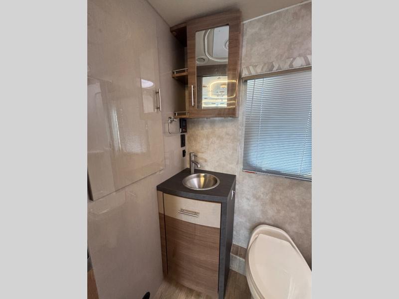 Hit the road knowing that you have all that you need at your fingertips in this Winnebago View Class C Diesel motorhome. Creating meals and snacks will be easy in the kitchen because of the two-burner range and convection microwave oven, and the Norcold double-door refrigerator/freezer will keep all of your perishable items cold and fresh. You will also find a pantry cupboard near the refrigerator for all of your dry and canned goods, and the overhead cabinets keep your daily dishes and kitchen items easily accessible. You will thoroughly enjoy the convenience of having a rear bathroom in this coach, and the Murphy bed will prove to be a huge asset in providing extra sleeping space at night while still keeping the interior free from clutter during the day.