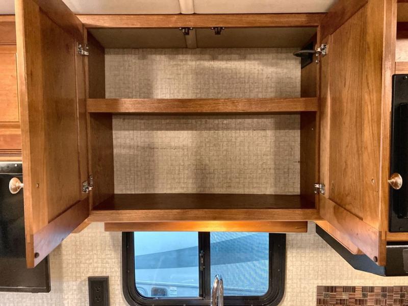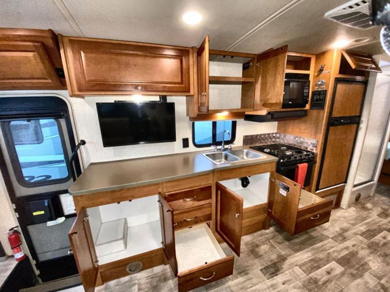 To the left of the entry door there is a counter area with a location for a 32" HDTV, a double kitchen sink, and a three burner range, plus refrigerator. If you need more sleeping space choose the optional Studio Loft powered bed that is 48" x 80" which drops down easily from above the cab area when ready to use at night.