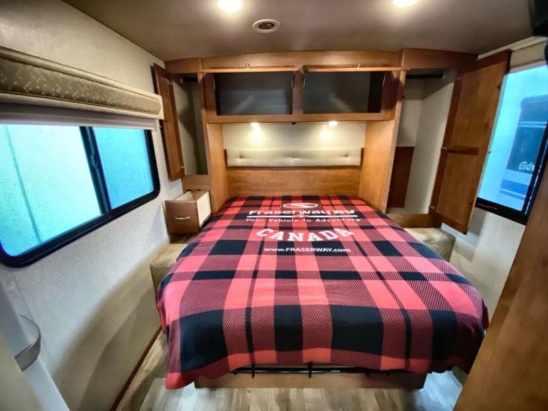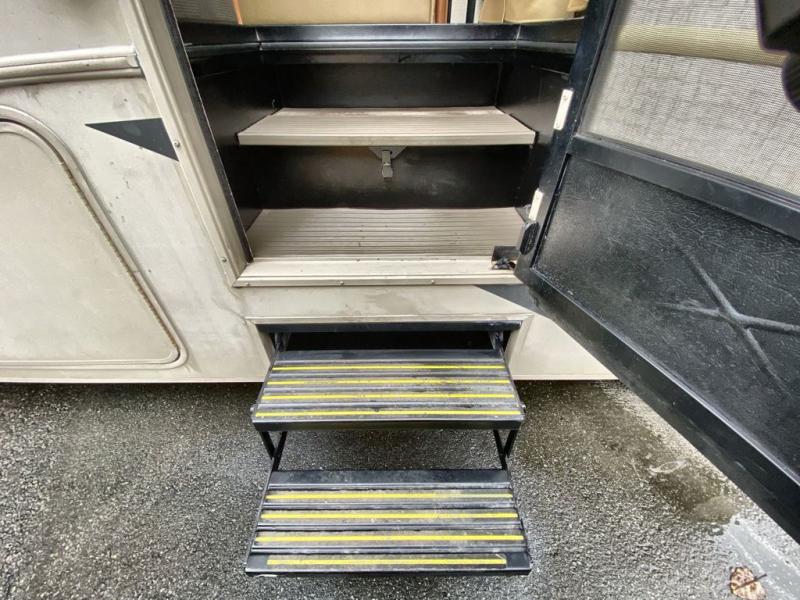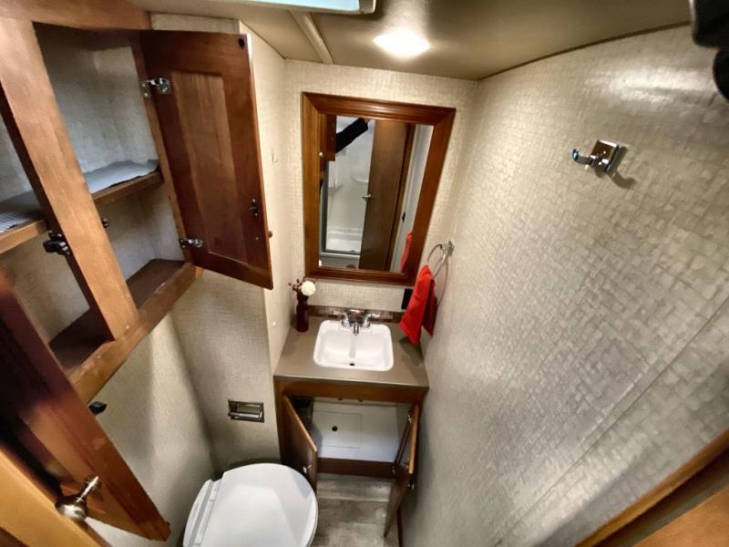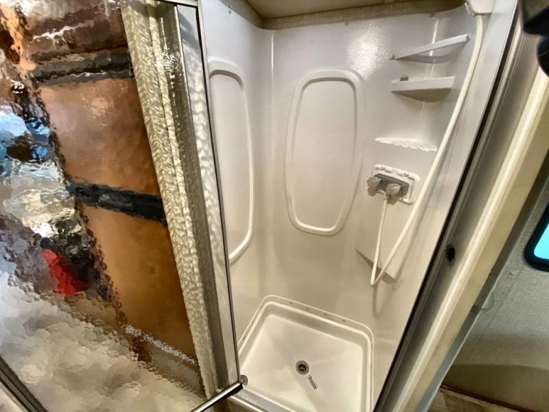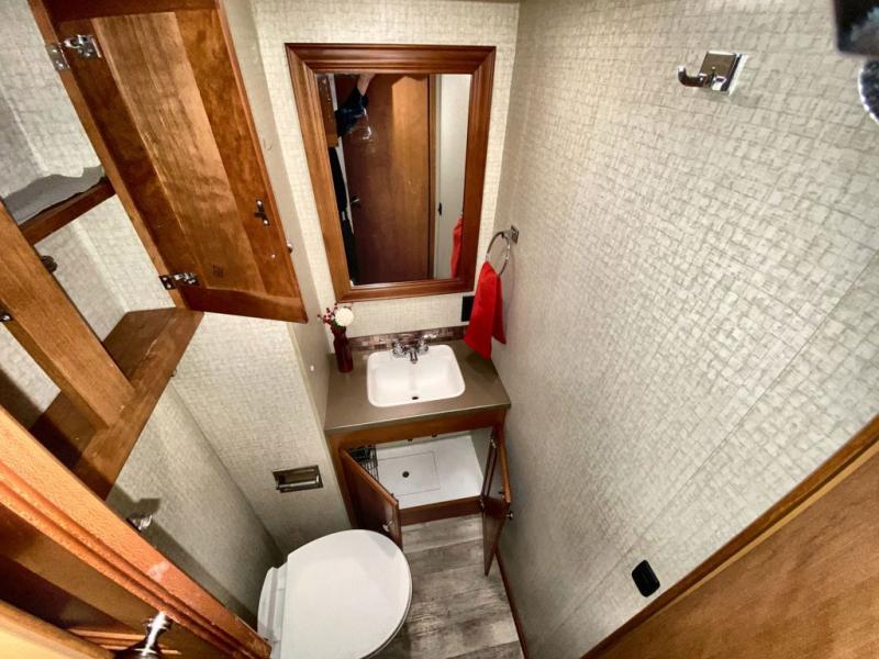 Just beyond the slide you will find a convenient shower along the curb side, and a private toilet area with sink along the road side including an overhead cabinet above the toilet. There is a folding door that can separate the bathroom from the bedroom area as well.