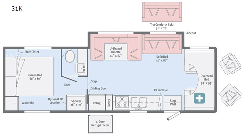 Every vacation you plan will be more enjoyable in this Spirit Class C gas motorhome. Because of a single slide that has been added into the design, this coach boasts an open-concept living area, which is a great place to have dinner together on the U-shaped booth dinette or to lounge on the sofa bed as you drink your morning coffee. And if you need some time to escape from the rest of the group in order to relax and recharge your batteries, you will find the rear, private bedroom the perfect spot to do so.