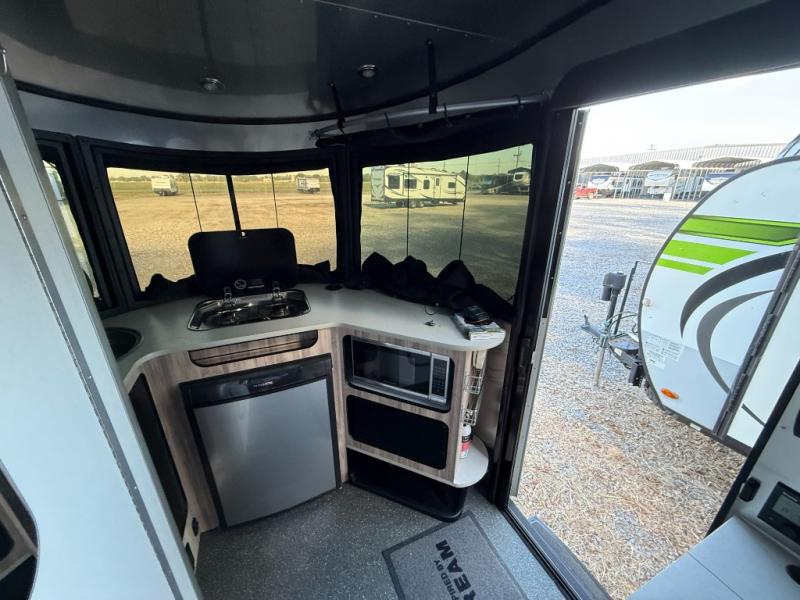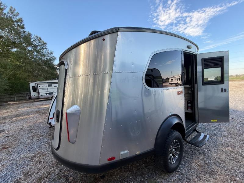If you are seeking adventure with less hassle this Basecamp 16X travel trailer might just fit your fun lifestyle. It's easy to hitch up and provides plenty of comforts of home for off-road and off-grid adventures. The front kitchen allows you to store perishables in the refrigerator and make meals on the two-burner cooktop. Just imagine relaxing on the bench seats with two pedestal tables in between while your storage is under your seat. You can configure the sleeping arrangements into one 76" x 76" complete bed or two smaller half beds whichever you prefer. The on-board wet bath comes in handy during the nighttime and daytime, and the retractable clothes line allows you to hang a wet towel or two. This model includes the Basecamp X package which adds features and accessories that increase departure angle and durability for more all-terrain use. Check this model out!