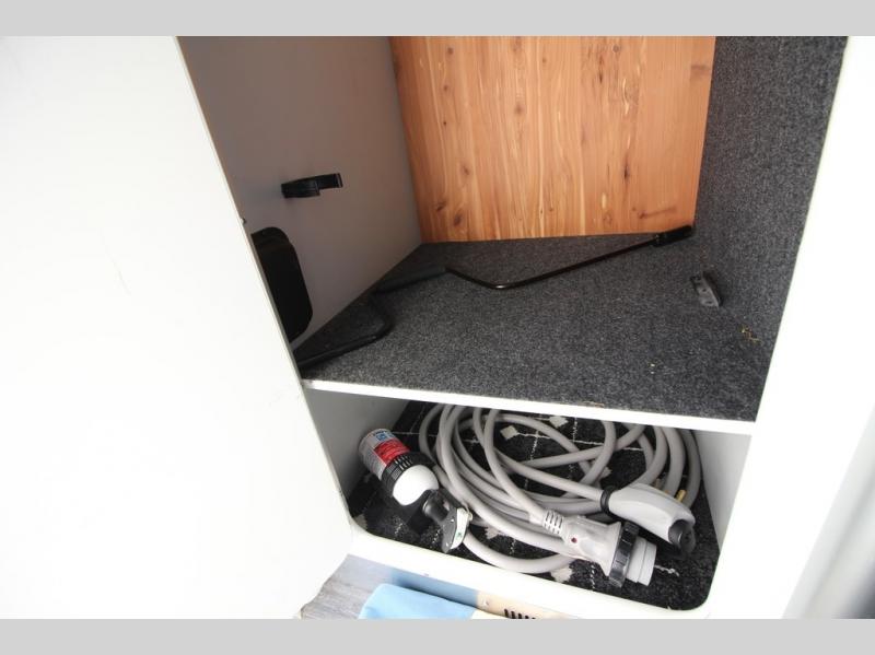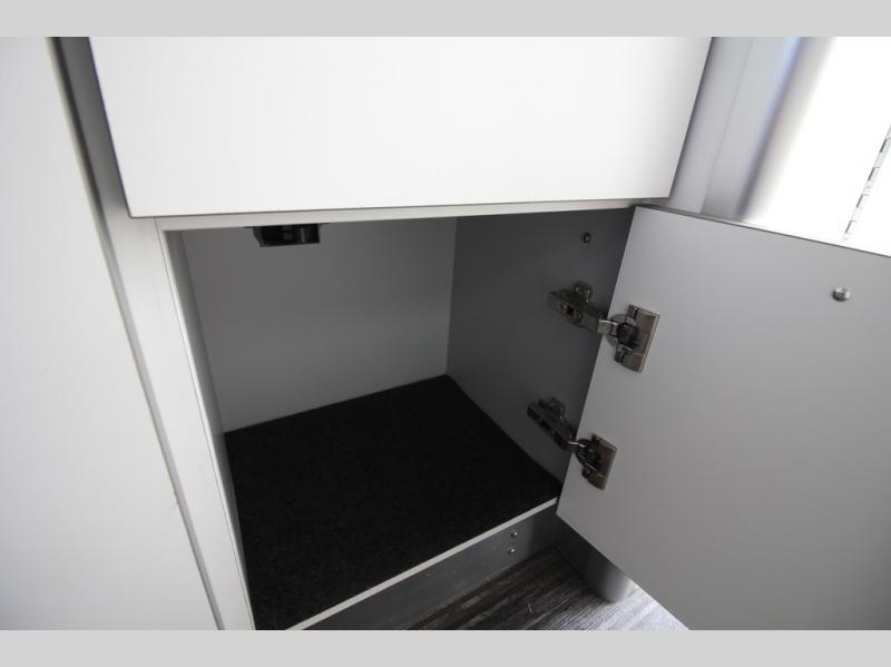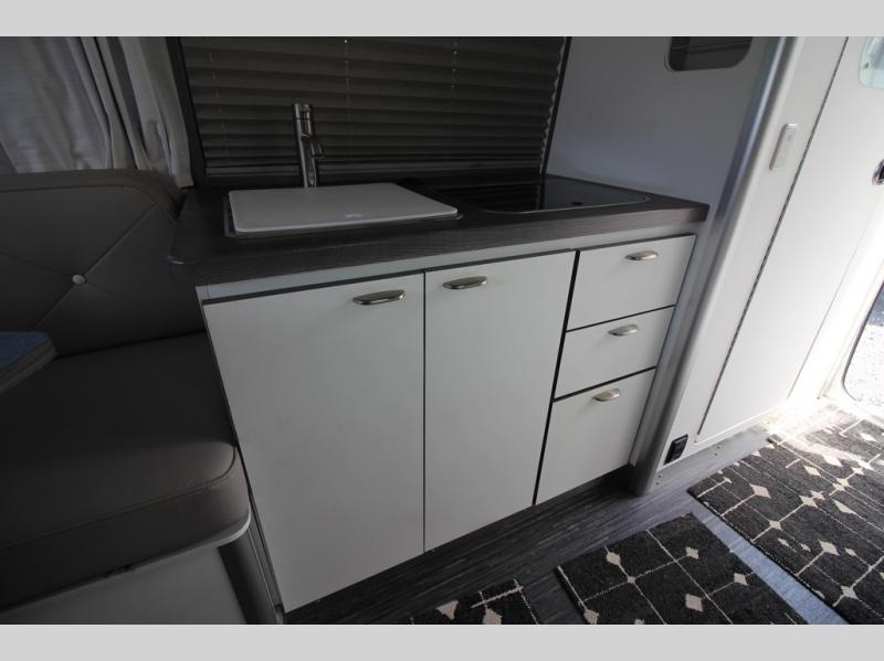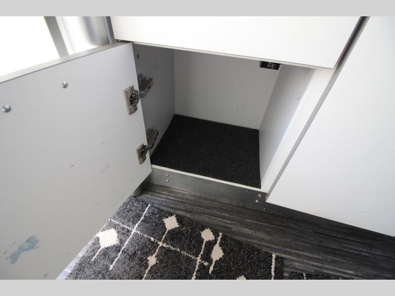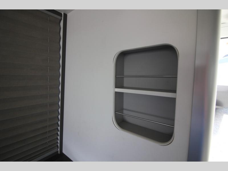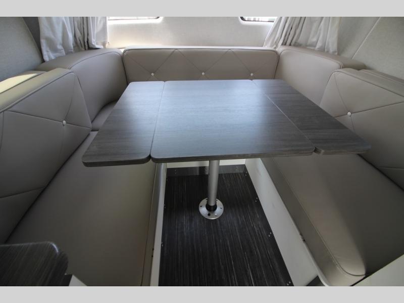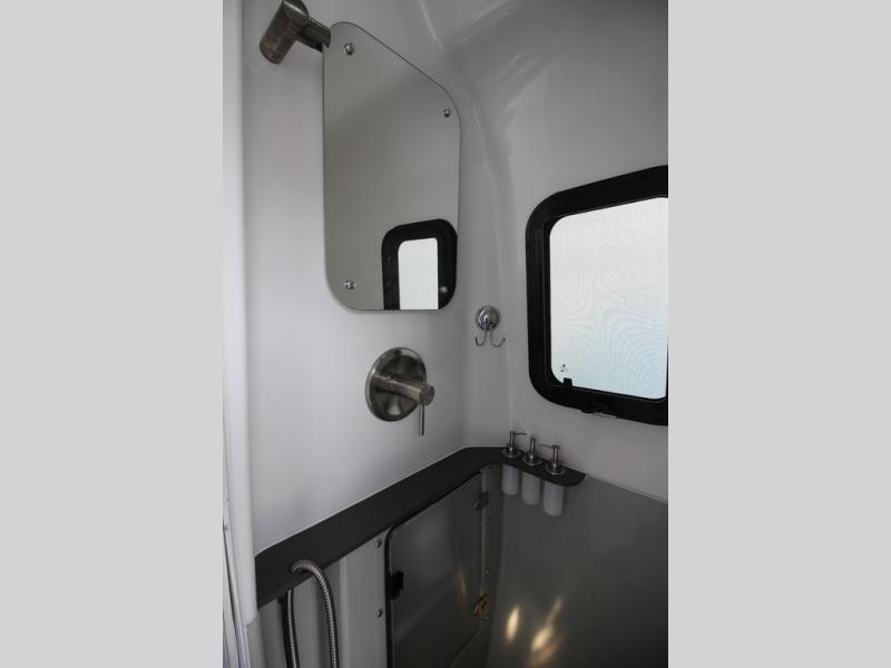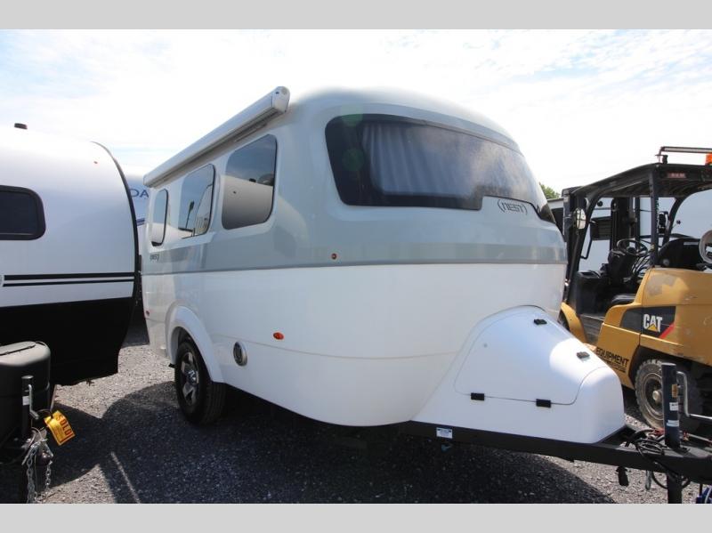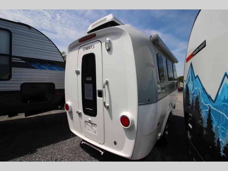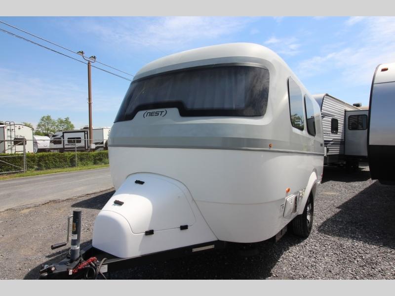 With any Airstream Nest travel trailer you are getting an easy to manage modern designed unit with all the comforts of home. You will find maximum storage throughout each model including overhead cabinetry and under bed storage for larger items, as well as two lockable storage compartments on the exterior. Inside each Nest travel trailer, you will enjoy LED lighting. There is also an abundance of natural light that streams inside through eight windows, including one skylight. Seamless vinyl flooring, along with fingerprint and stain resistant soft white laminate, means easy care maintenance during and after each trip. And, easily accessible pop-up USB ports are located in the galley/dinette area, as well as near the bed so you can keep all of your electronics charged and ready to use. For your outside enjoyment, there is a powered patio awning with LED lights which makes it easy to enjoy time outside even after dark. There is also an exterior shower with hot and cold faucets so you can rinse off any evidence of outdoor fun before heading inside. Let a new Airstream Nest be your new cozy retreat for two!