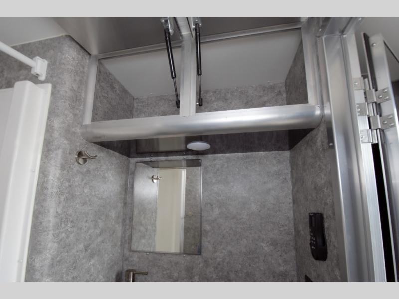 Full bathroom with a rectangular shower and porcelain RV toilet