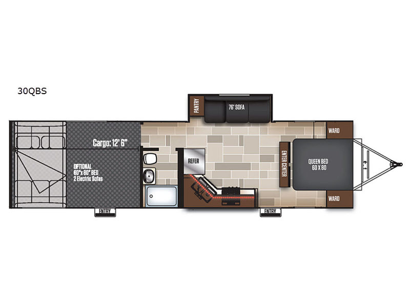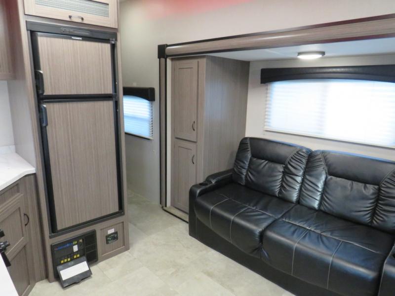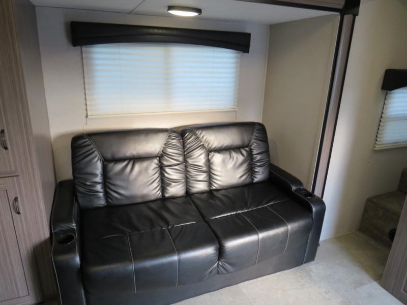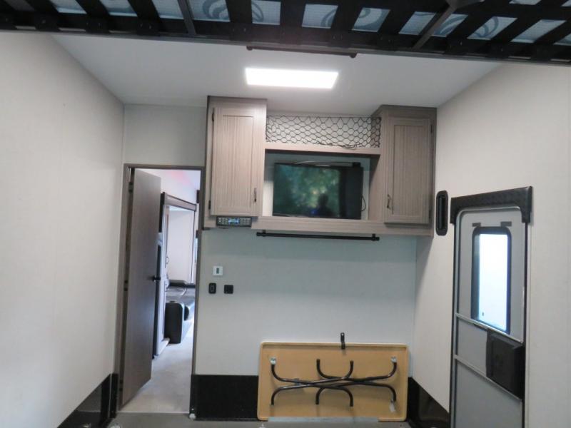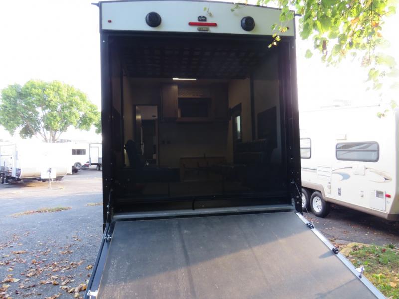 Do you see yourself as a thrill seeker that enjoys pushing the limits? Does your spouse enjoy her own bedding when you travel? This Adrenaline toy hauler travel trailer might be the perfect compromise for travelling with your off-road toys and your spouse. Just imagine loading your motorcycle or ATV using a Zero Gravity ramp door into its own separate garage with 12'6" of cargo space. You might even choose to add an optional queen size electric bed with rollover electric sofas below. Model 30QBS will have you relaxing in the main living and kitchen area on the sofa slide out, or sleeping at night on your own queen bed in the front bedroom. Everyone will enjoy having a full kitchen including a convection microwave and cast iron cooktop, plus a full bathroom to get cleaned up where ever you stay. Take a look today to see what else will make this the perfect choice for you, your spouse, and your lifestyle!