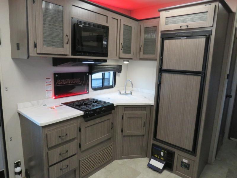 With any Coachmen RV Adrenaline toy hauler travel trailer you will appreciate the 8' 6" wide-body construction with Azdel Onboard composite sidewalls, Dexter Axle brand E-Z Lube, Flex Suspension, and Nev-R-Adjust brakes for a safer and smoother ride to every camp outing. The 30 gallon fuel station will keep the toys running the entire weekend, and the USB ports will allow the electronics to stay fully charged all while the 40" Jensen LED TV keeps you entertained when indoors. Come choose your favorite model, and enjoy the Adrenaline rush today!