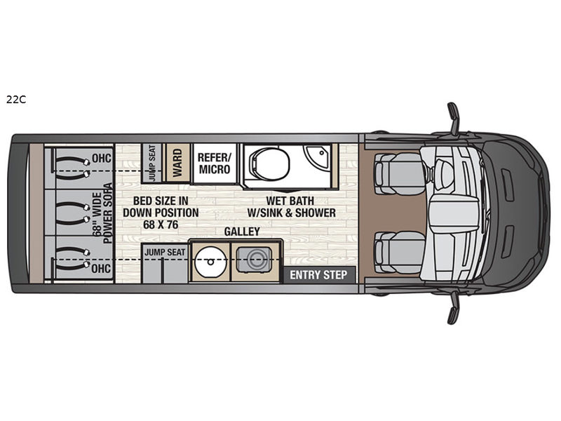 Comfort and style are around each corner in this versatile coach. Model 22C features five set of seatbelts for your family and friends to ride along to a local game, or state event. The rear power sofa provides sleeping for two with the dimensions of 68" x 76" when in the down position. There are two jump seats for more seating for visiting and relaxing. You will have the convenience of a wet bath, and a galley kitchen with appliances to make meals and snacks for the whole gang. You can even watch the big game on the 22" LED TV, plus sit outside under the Carefree armless awning with wind sensing and LED lighting, plus so much more!