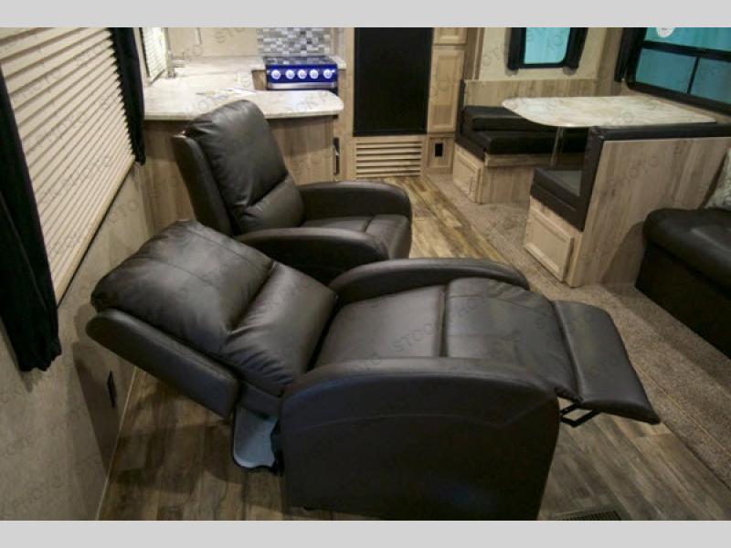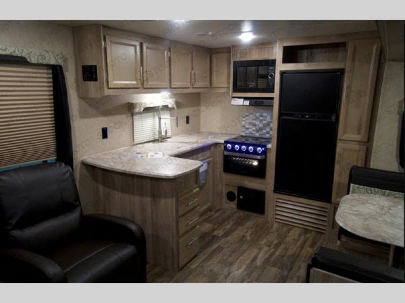 The rear kitchen is a notable feature of this Coachmen Catalina Legacy Edition travel trailer. You will enjoy all of the counter space, as well as the extra storage space with the pantry. The bathroom features a 34" x 34" radius shower with a glass door, and there is a private entry door from the bathroom into the master suite. Outside you will enjoy the shade that comes from the 15' electric awning with LED lights, plus there is a large pass-through storage area for your extra camping gear.