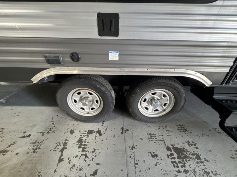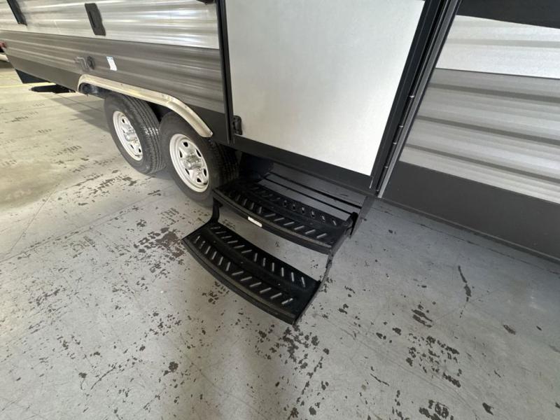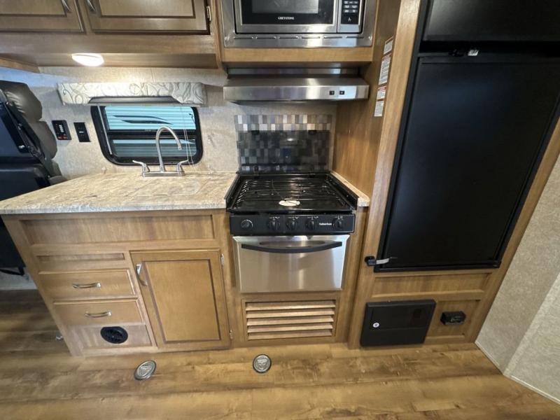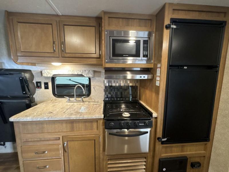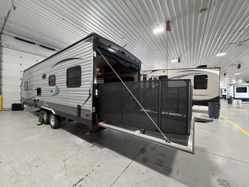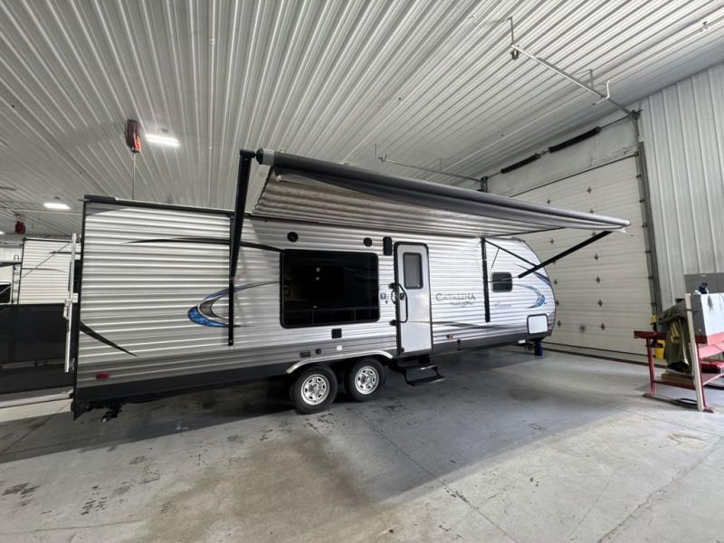 You will love blazing your own trails with the toys you pack inside this Catalina Trail Blazer toy hauler model 26TH. You will love how easy it is to load and unload using the 90" x 74" rear ramp door. If you choose the optional party deck package available then you can create a raised outdoor living space to enjoy when you come in from a fun day of riding or playing. When nightfall arrives, you can fold down the sofa and create added sleeping space for family members or a few added friends. There are also overhead cabinets for your daily dishes and other kitchen items. You will have no trouble whipping up meals and snacks in the fully equipped kitchen to stay fueled for more fun. On the outside, a 15' power awning is great for creating a protected outdoor living space from the wind, sun, and rain. There is also exterior storage in front for all of your outdoor camping gear too!
