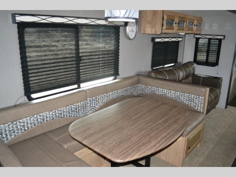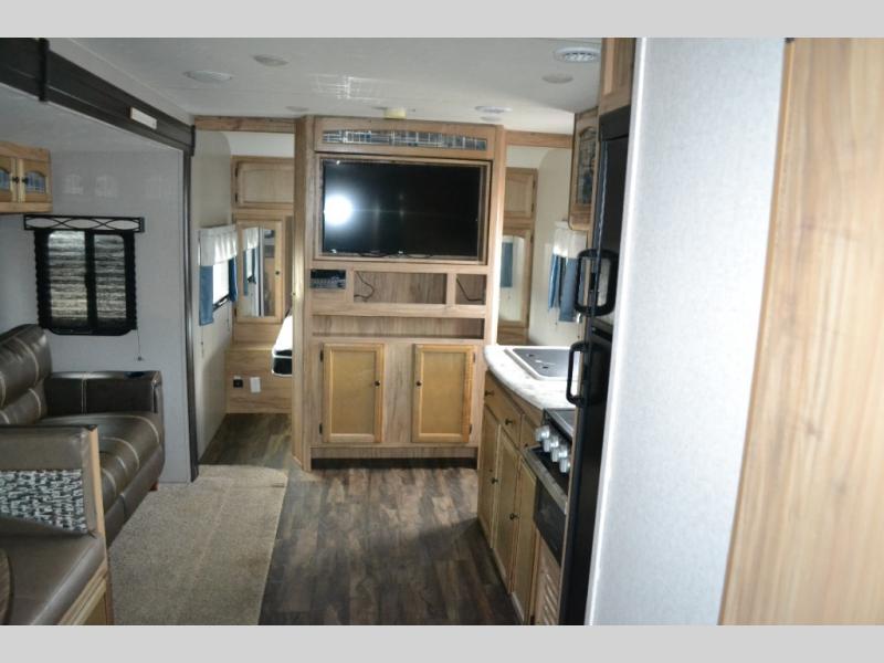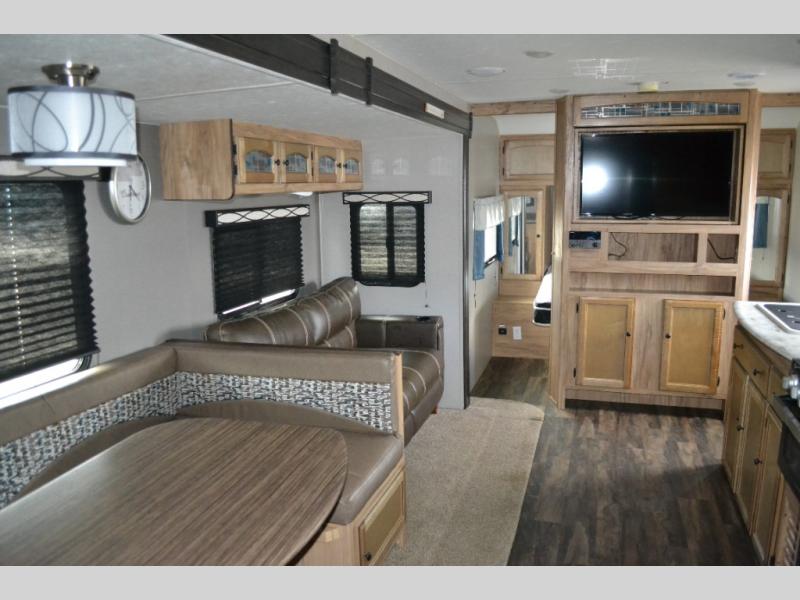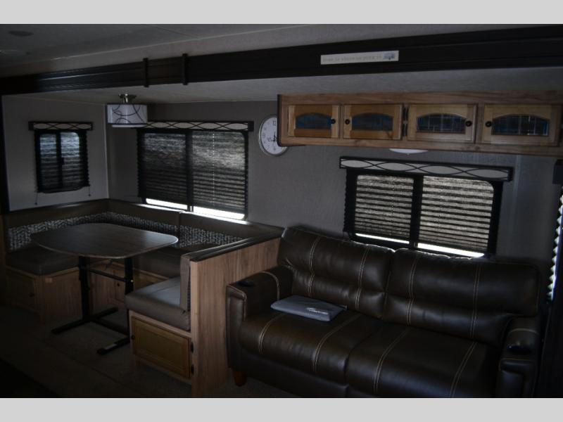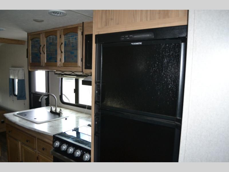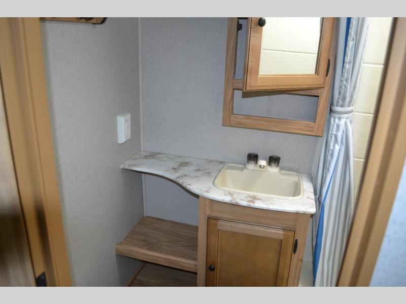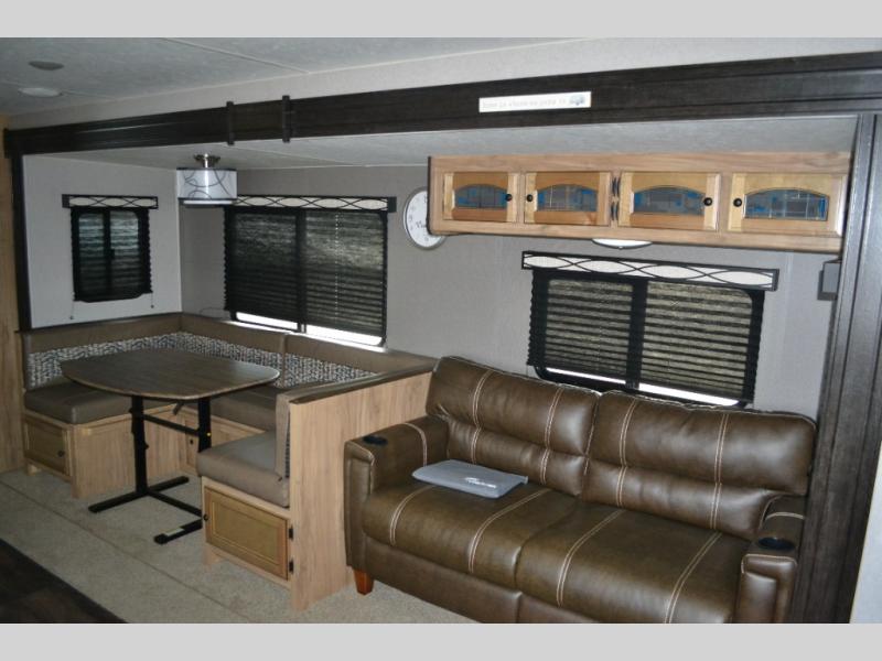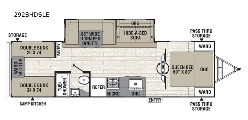 If you have been searching for a travel trailer to accommodate the whole family plus a few extra friends, stop looking! This Freedom Express Maple Leaf Edition bunkhouse model offers sleeping space for ten plus so much more. When you aren't playing outside everyone can gather in the living area around the u-shaped dinette and hide-a-bed sofa within the slide out while mom or dad makes snacks. The chef of the family can prepare breakfast on the three burner range or outside at the camp kitchen if the weather is nice. At night you will probably find the kids and their friends in the bunkhouse on the four bunk beds. This unit also includes plenty of storage, including a pass through storage, a pantry, and overhead cabinets.