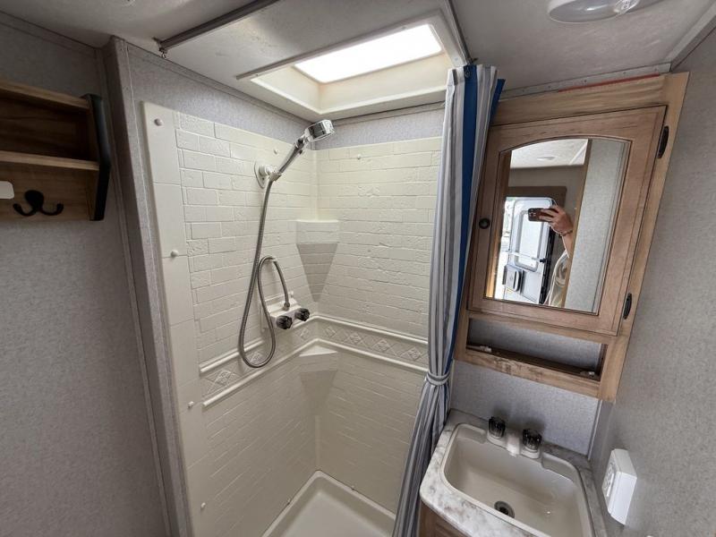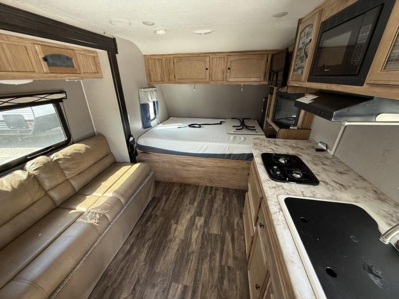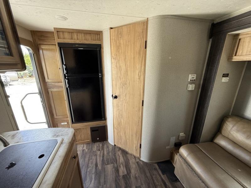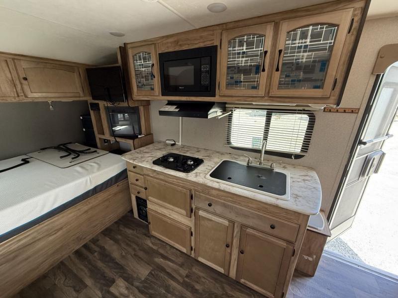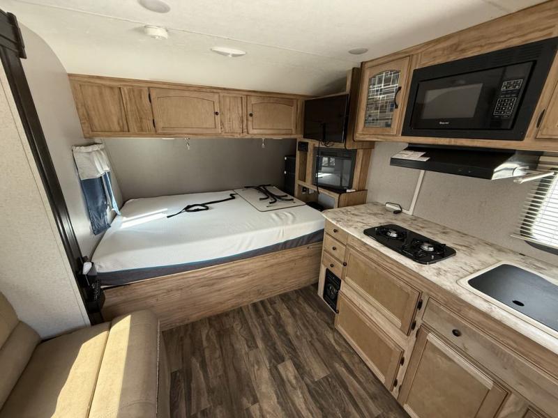 It's time to hitch up this Freedom Express Pilot travel trailer to your favorite vehicle and hit the road. This model offers all of the conveniences you'll need to enjoy time away in the great outdoors. The single slide houses a sofa that provides a dining area and extra sleeping space, and the cook in the family can make dinner each night with the microwave or on the two-burner cooktop which also includes a butcher block cover. You can even watch the LED TV from anywhere in the trailer, and having a full bathroom allows you to camp off grid without worrying about finding public rest stops. Having the LED light strip in the exterior pass-through storage makes loading or unloading your outdoor camping gear much easier to do once the sun has set.
