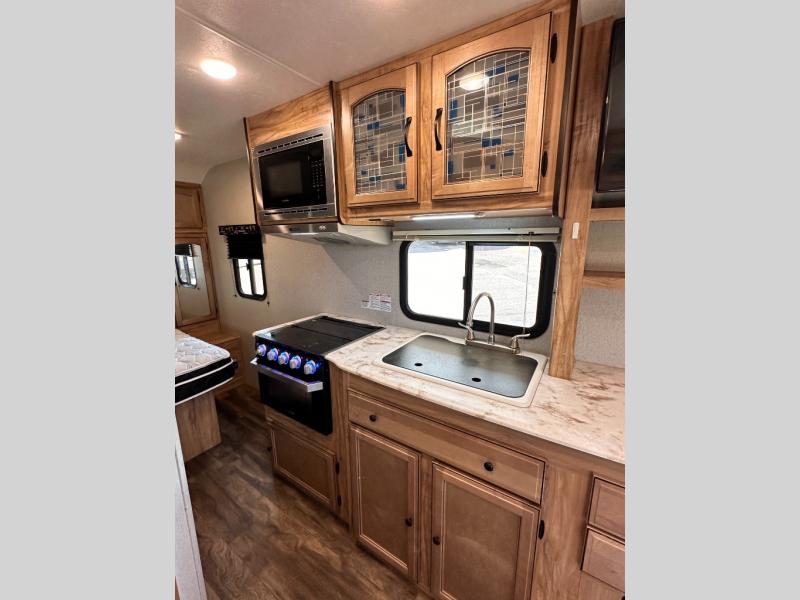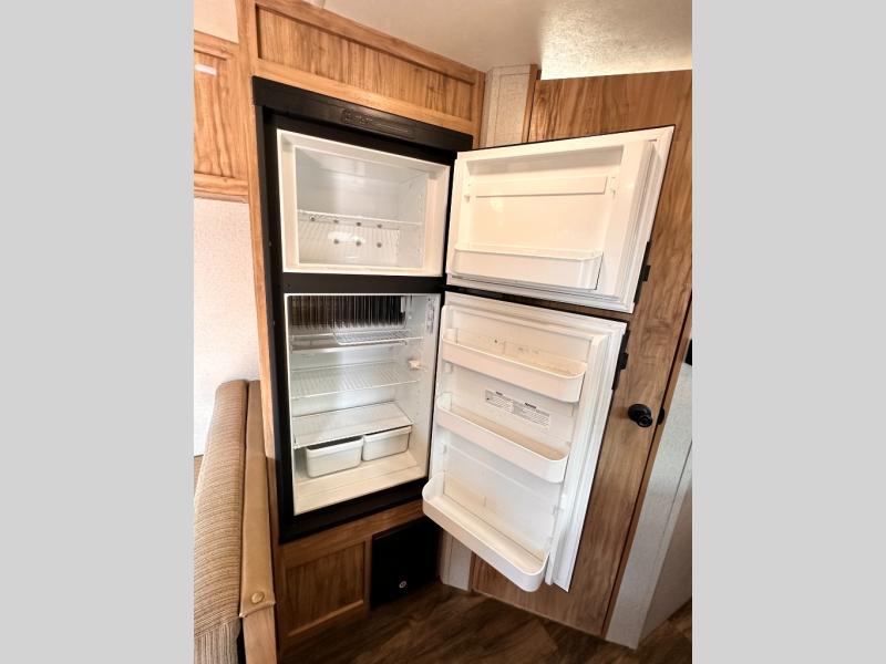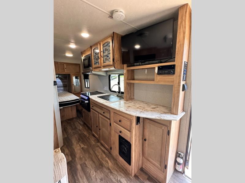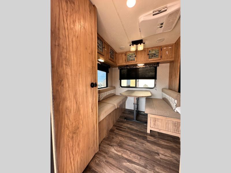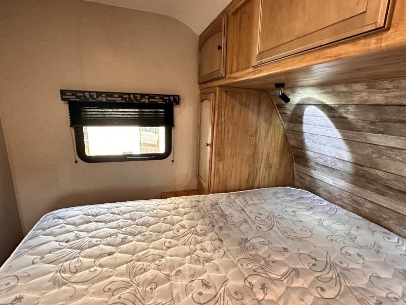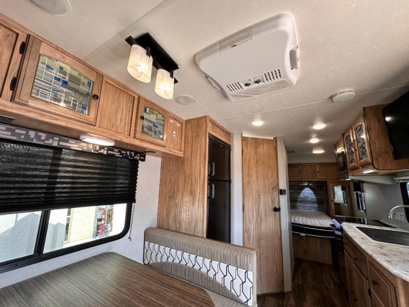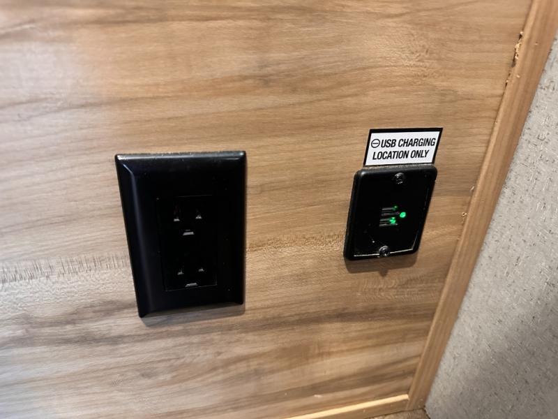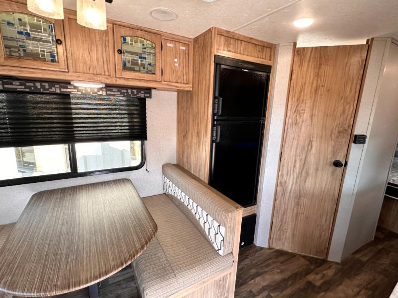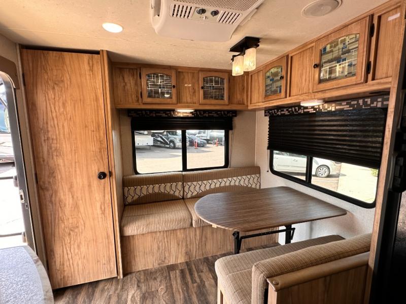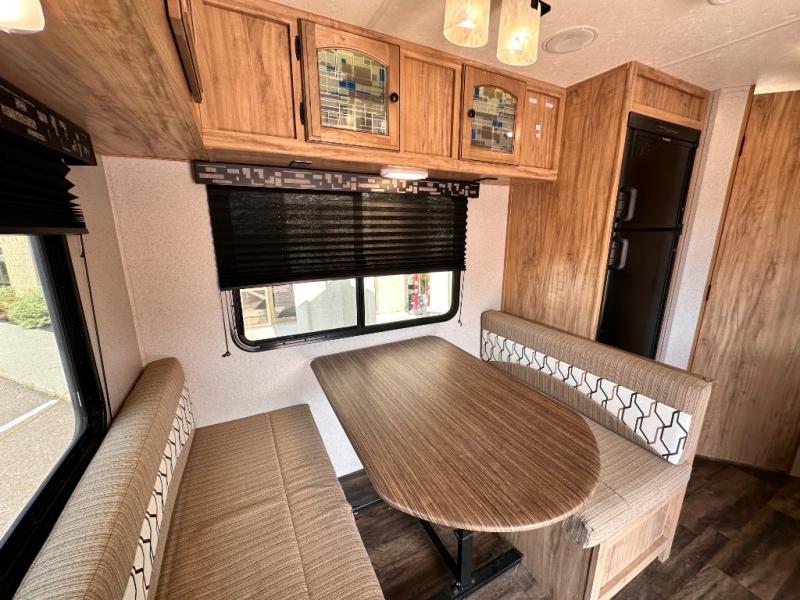 Start your next vacation right in this travel trailer that will comfortably sleep four people each night either on the queen bed up front or the dinette once folded down. This unit is satellite ready and includes USB ports to keep your electronics charge the whole trip. The family can eat meals and play cards at the booth dinette that features an extended dinette cushion for more seating space. The centrally located full bath includes a shower skylight for more natural light and extra standing room!