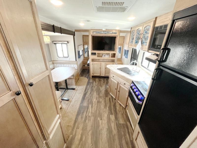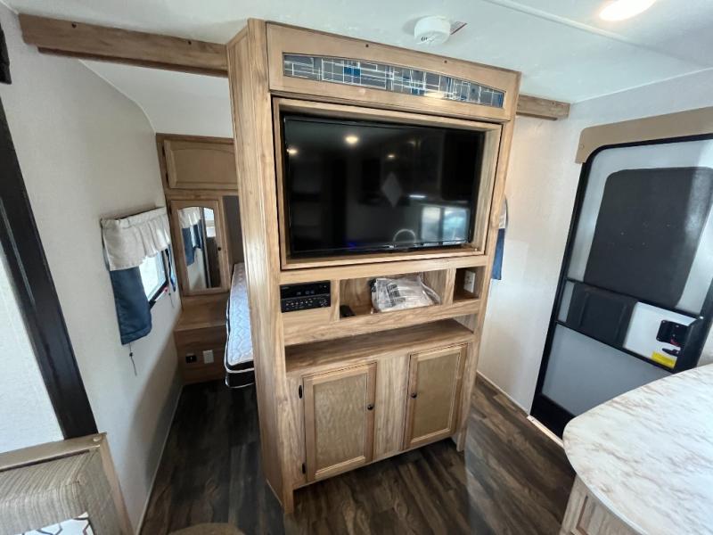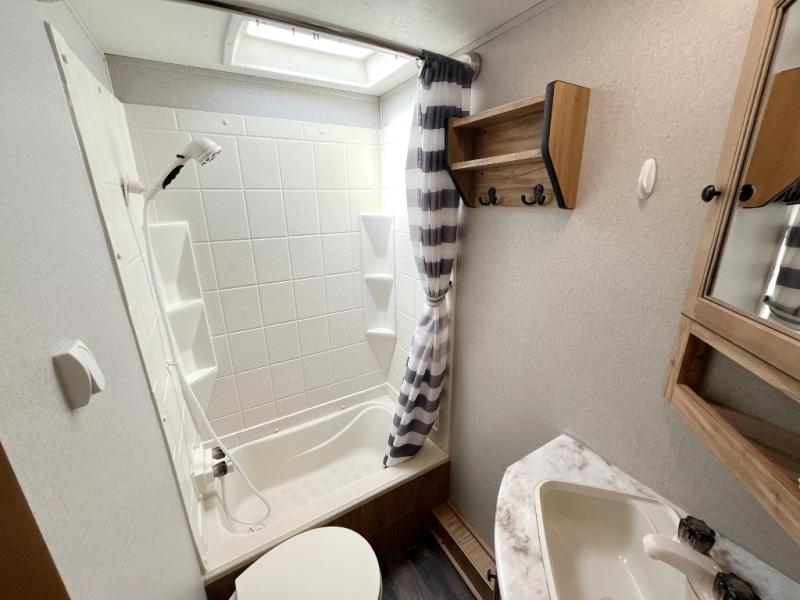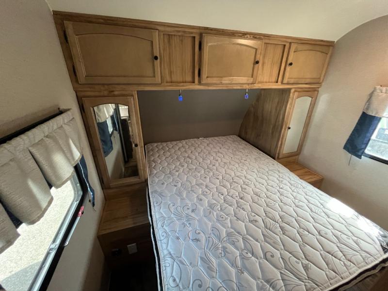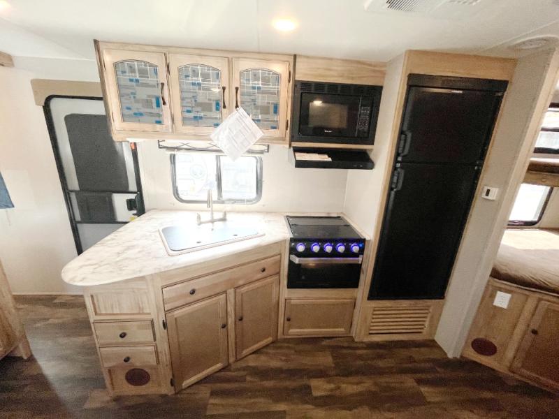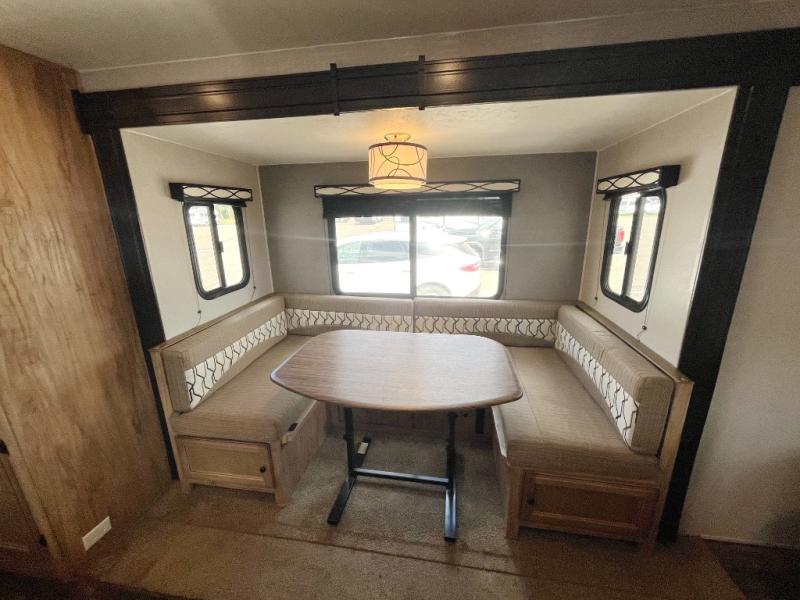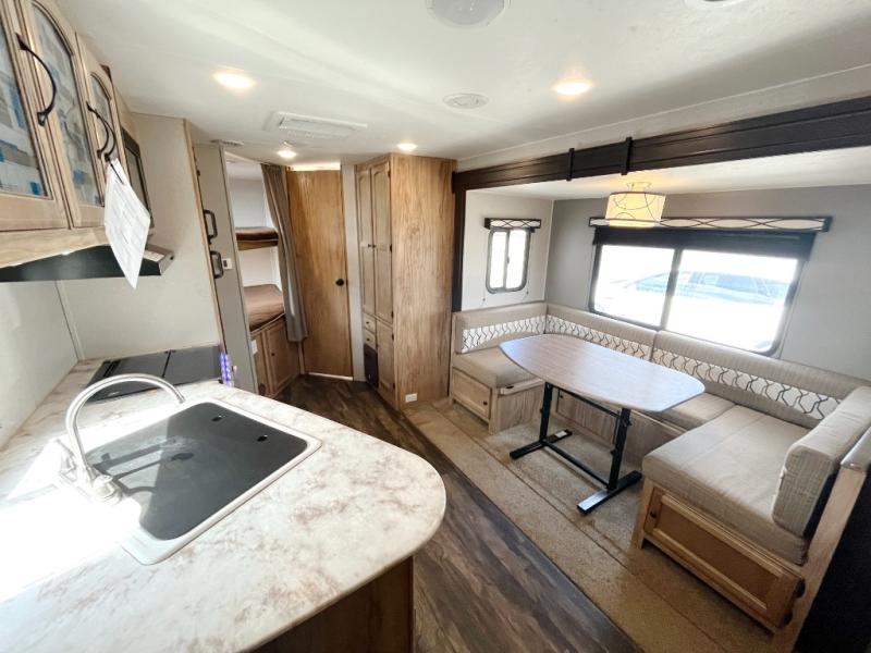 You can dine, play games, and sleep in this this travel trailer that will comfortably fit your family of eight perfectly. The front private bedroom includes a queen bed, plus wardrobes for your shoes and clothes. The kids will love the double bunk beds and with the rear corner bath right next to the bunks, it will be easy for them to use the restroom at night. Enjoy a game of cards around the 88" wide u-shaped dinette, or take the removable resin outdoor table outside to enjoy some fresh air. The chef of the family can prepare dinner on the outside camp kitchen and everyone can enjoy the electric awning with LED lights!