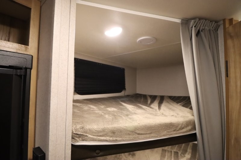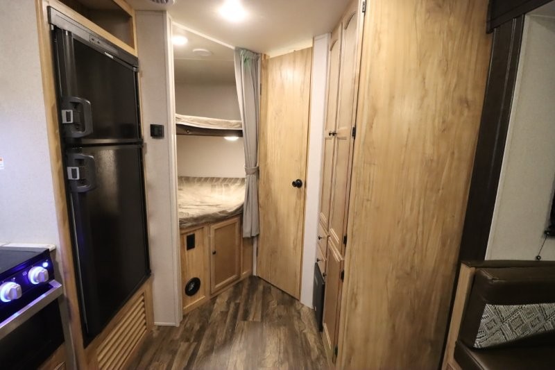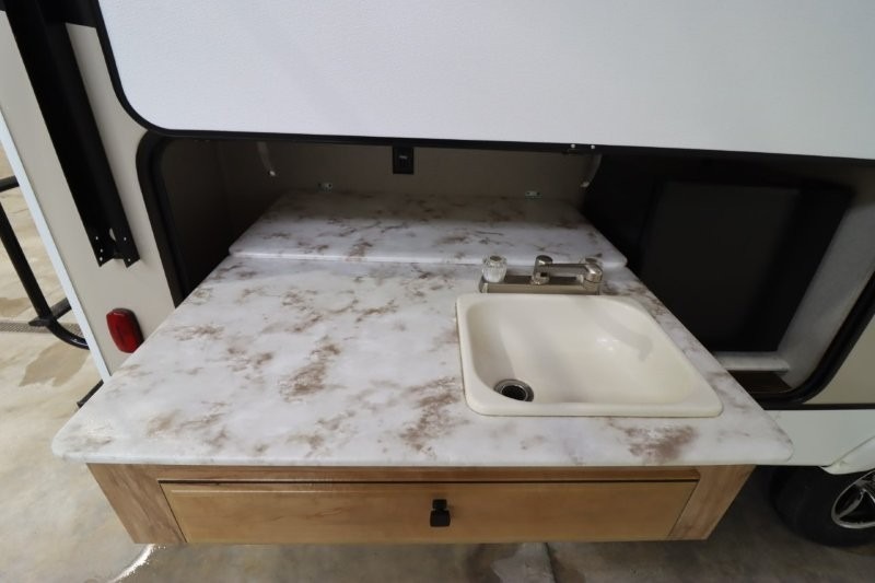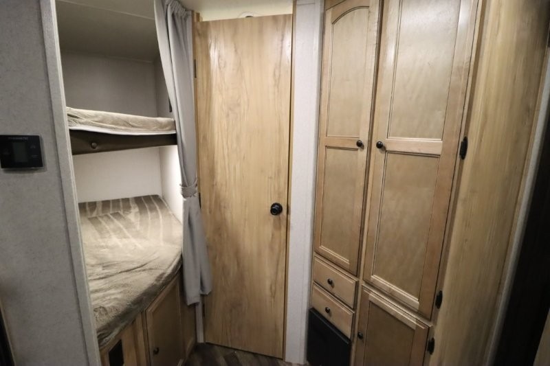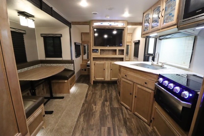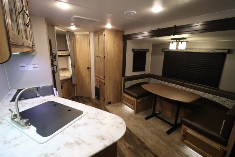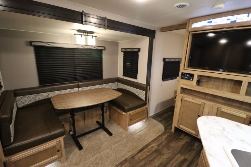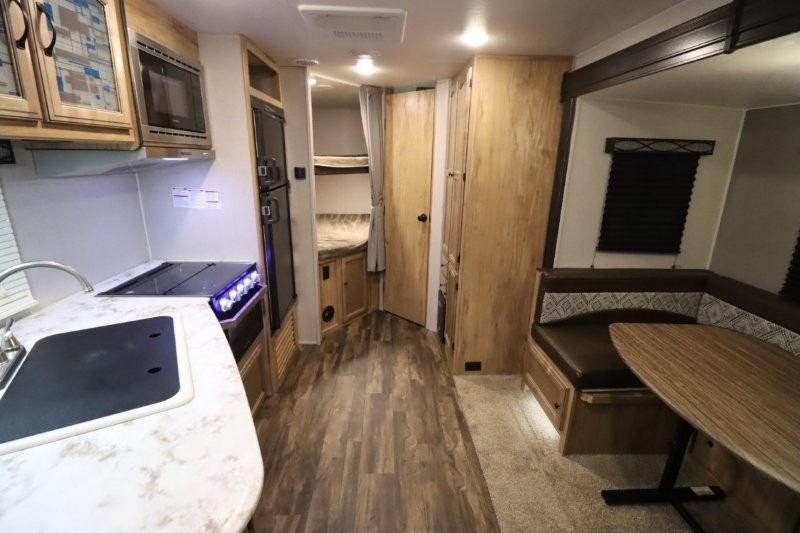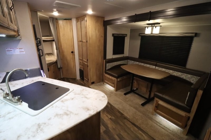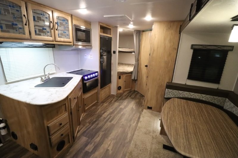 You can dine, play games, and sleep in this this travel trailer that will comfortably fit your family of eight perfectly. The front private bedroom includes a queen bed, plus wardrobes for your shoes and clothes. The kids will love the double bunk beds and with the rear corner bath right next to the bunks, it will be easy for them to use the restroom at night. Enjoy a game of cards around the 88" wide u-shaped dinette, or take the removable resin outdoor table outside to enjoy some fresh air. The chef of the family can prepare dinner on the outside camp kitchen and everyone can enjoy the electric awning with LED lights!