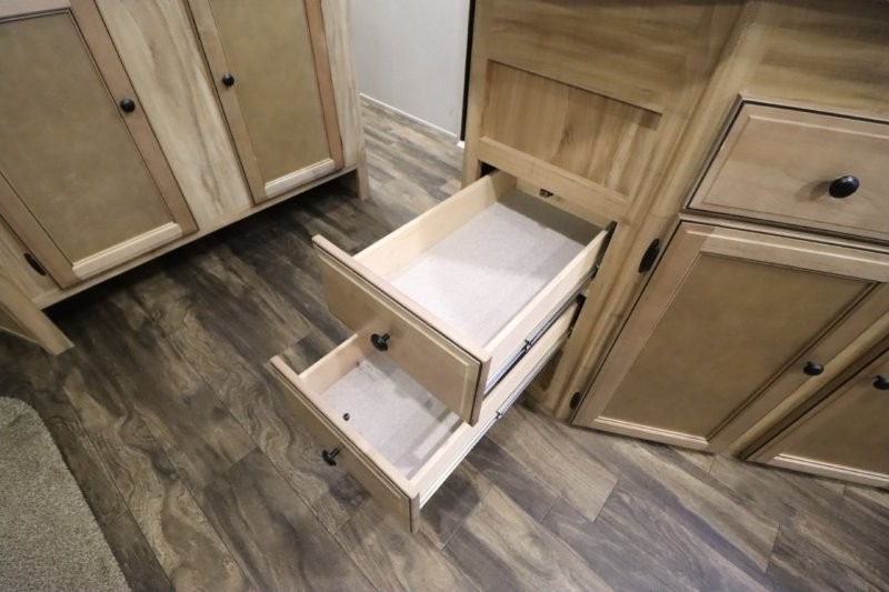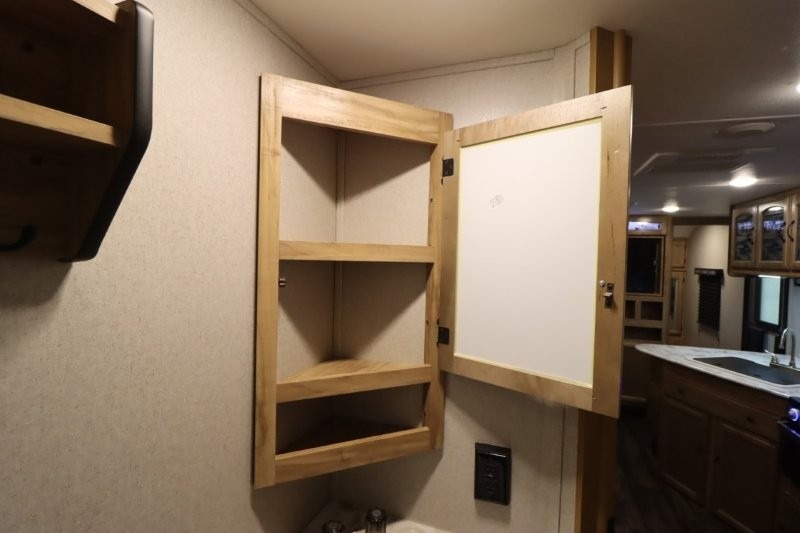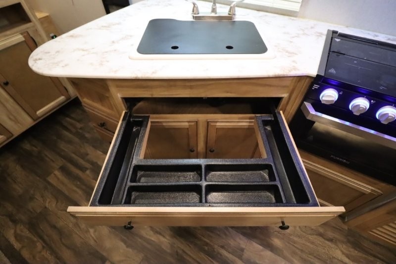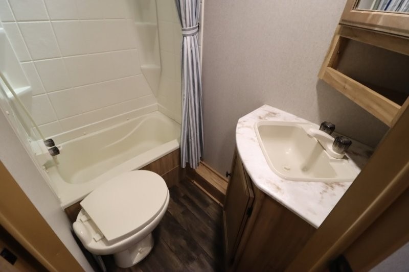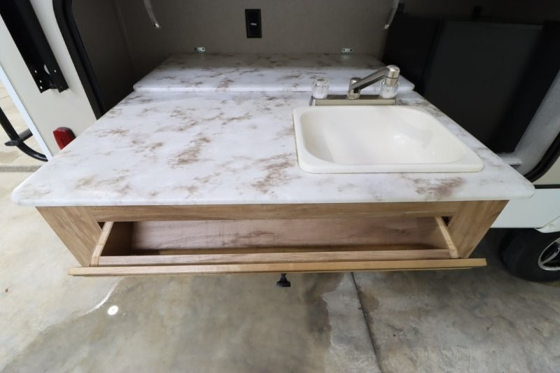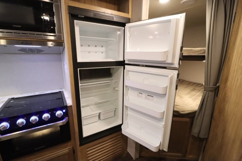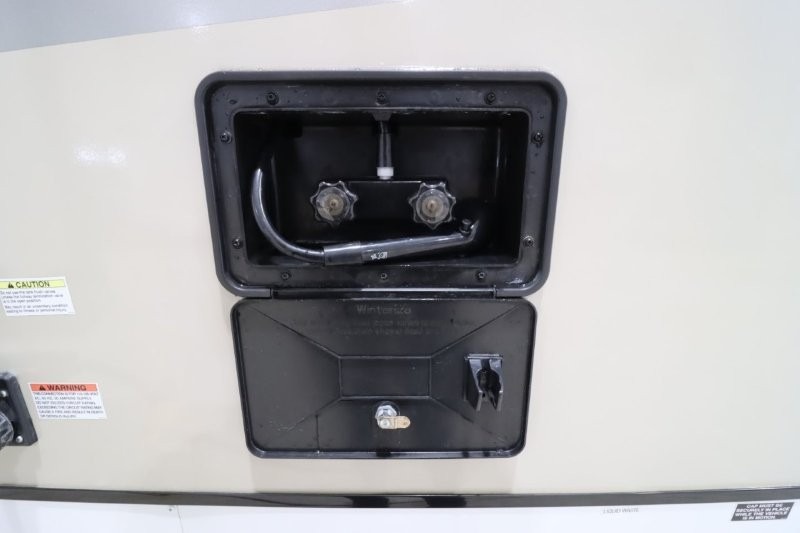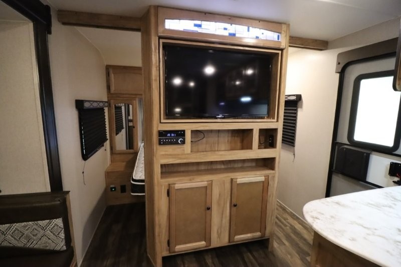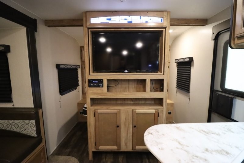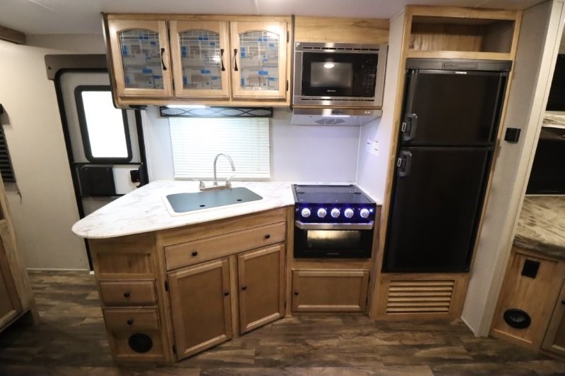You can dine, play games, and sleep in this this travel trailer that will comfortably fit your family of eight perfectly. The front private bedroom includes a queen bed, plus wardrobes for your shoes and clothes. The kids will love the double bunk beds and with the rear corner bath right next to the bunks, it will be easy for them to use the restroom at night. Enjoy a game of cards around the 88" wide u-shaped dinette, or take the removable resin outdoor table outside to enjoy some fresh air. The chef of the family can prepare dinner on the outside camp kitchen and everyone can enjoy the electric awning with LED lights!