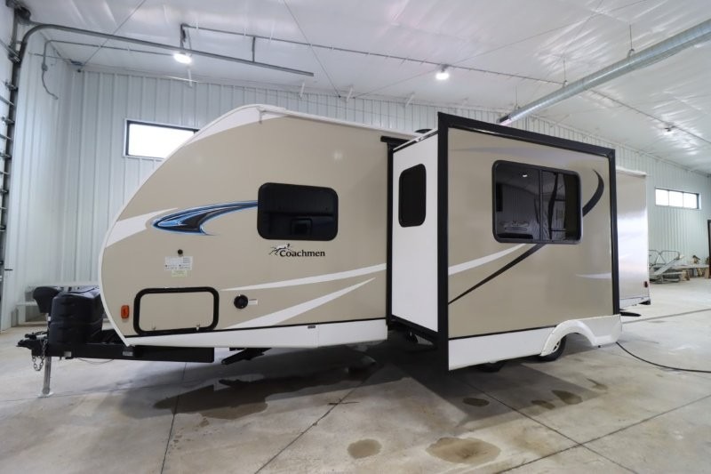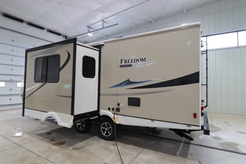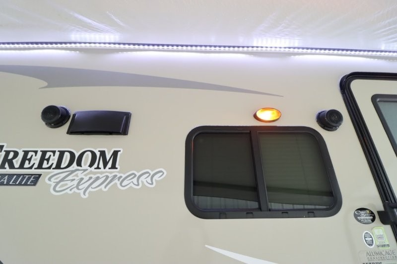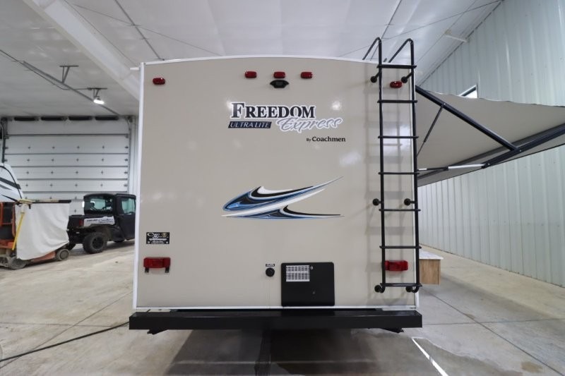 With any Freedom Express Ultra Lite travel trailer by Coachmen you will appreciate of ease of towing behind your family vehicle. All the tanks are located under the floor to lower the center of gravity for increased storage capacity and improved handling down the road. Inside, you'll enjoy features such as, LED lighting throughout, Congoleum Designer Carefree Flooring, an LED TV, plus a 6 cu.ft. double door refrigerator to name a few. The pass through storage with an LED light strip allows you to easily bring along those larger camping items, plus there is an electric awning with LED lights outdoors as well as an exterior shower station to wash off your hiking boots. Come see how you have the freedom to explore in a Freedom Express Ultra Lite travel trailer today!