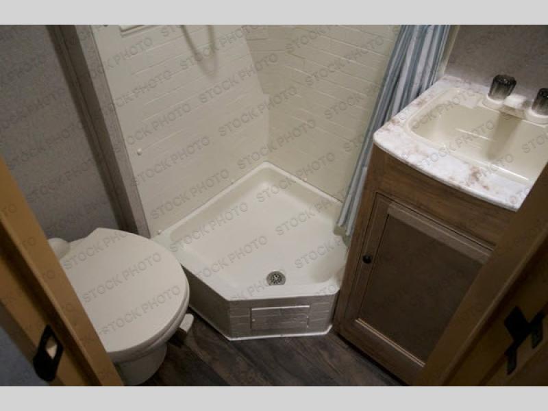 Designed to comfortably sleep four, this travel trailer is perfect for couples, small families, or weekend guests. The rear corner bathroom provides privacy and convenience, making it easy to freshen up after a day outdoors.
