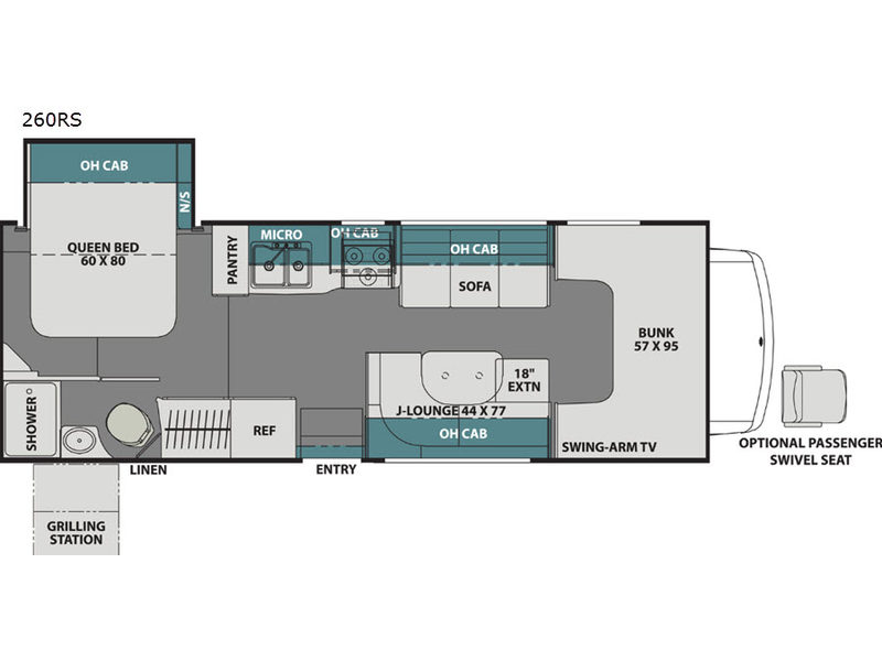 Beginning with a full kitchen to make meals on the go, to a full bathroom with a shower to stay refreshed for shopping in town, this coach will take you there in style and comfort! There are plenty of sleeping arrangements in this unit, including the rear bedroom that has a queen bed slide for more walking around room, and the cab-over bunk for the grandkids. You will have a sofa and a J-lounge for relaxing, playing games, and enjoying time with family throughout your trip. Both of these pieces of furniture fold down for extra sleeping space. Outside, you can relax under the 18' power awning, and you may like to add the optional grilling station to enjoy the great outdoors more often!