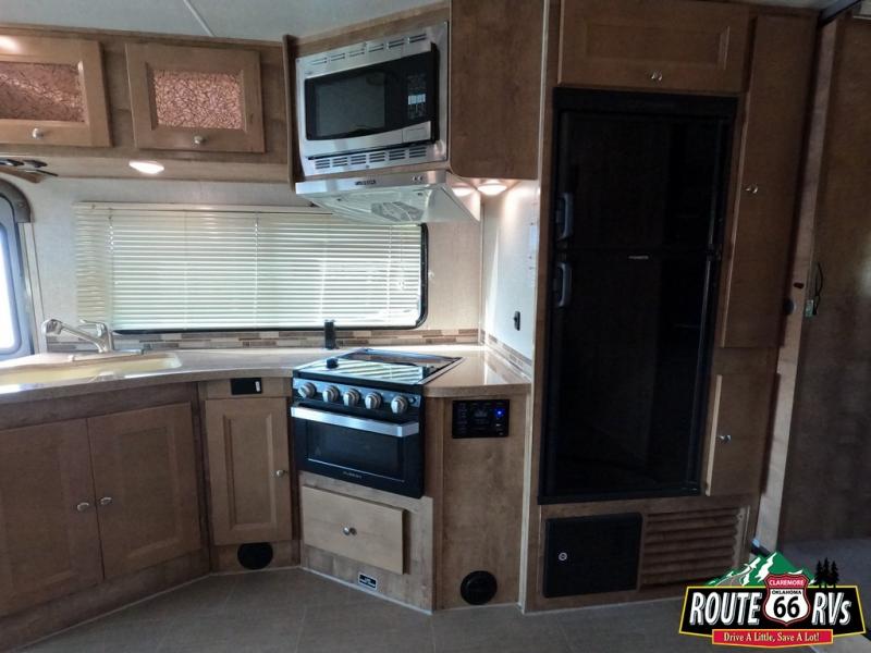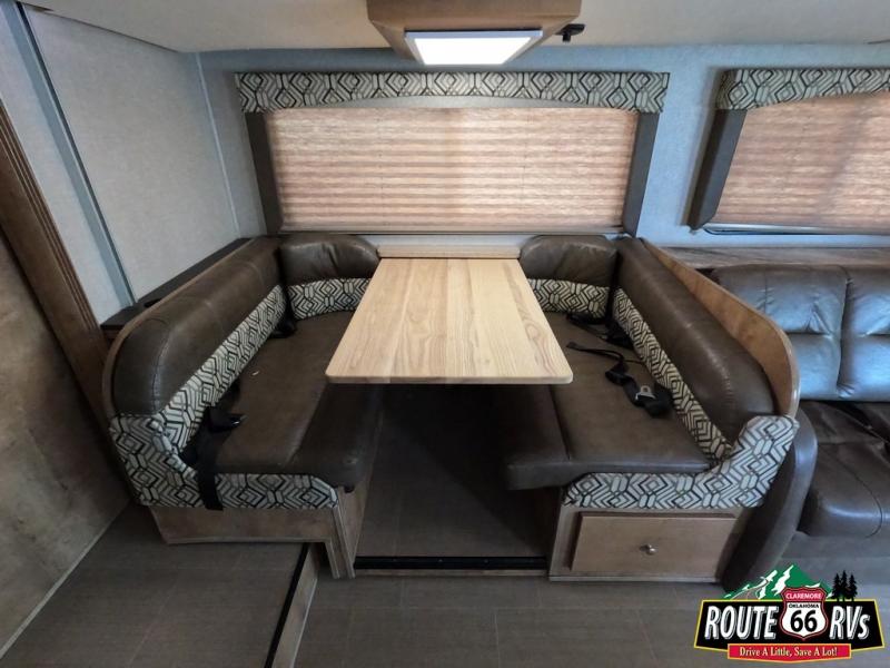 Travel comfortably with family and friends enjoying a great time on your next road trip with this Leprechaun 280BH as your home base. This unit easily sleeps 8 with the use of the sofa and power salon style bunk that drops down over the dinette and sofa. There is also comfortable sleeping in the rear private bedroom featuring a queen bed slide out as well as up on the 57" x 95" over cab bunk. This makes it easy for your larger family to be comfortable, or the kids can bring along a friend or two. When it comes to relaxing there is plenty of seating for everyone inside, and an outdoor entertainment center allows you to enjoy even television watching outside.