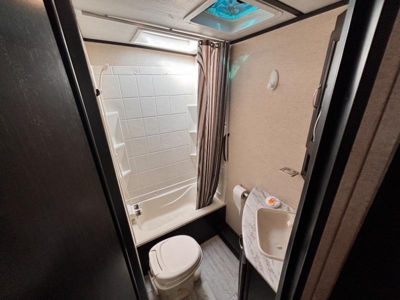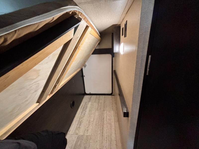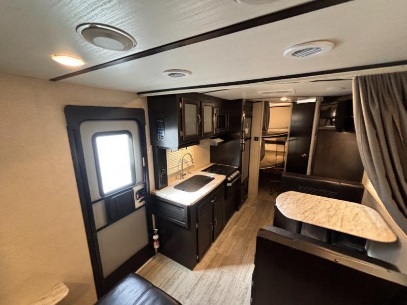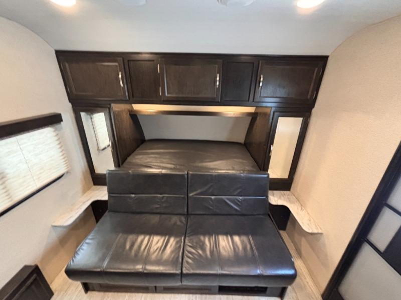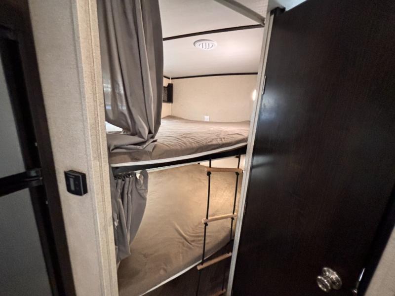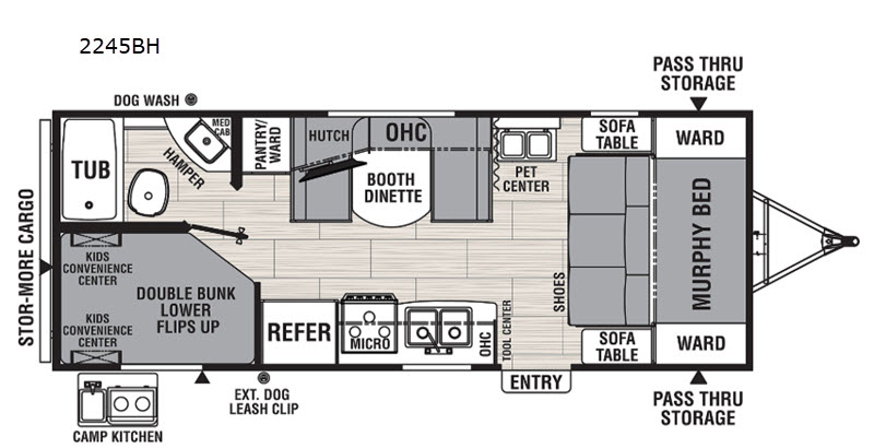 Load up the kids and head out to your greatest camping adventure in this 2245BH travel trailer! The front Murphy bed gives you versatile living with a sofa to sit on during the day and a bed to lay on at night, plus there is a pet center by it and a privacy curtain that can be drawn. The rear bunk beds are sure to be a crowd pleaser with your kids especially when they use the two convenience centers. Inside the rear corner bathroom you will find plenty of convenient features like the laundry hamper and the medicine cabinet. The chef of your group can choose to cook indoor or at the outdoor camp kitchen and enjoy their pets company with the exterior dog leash clip!