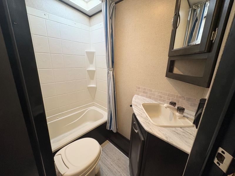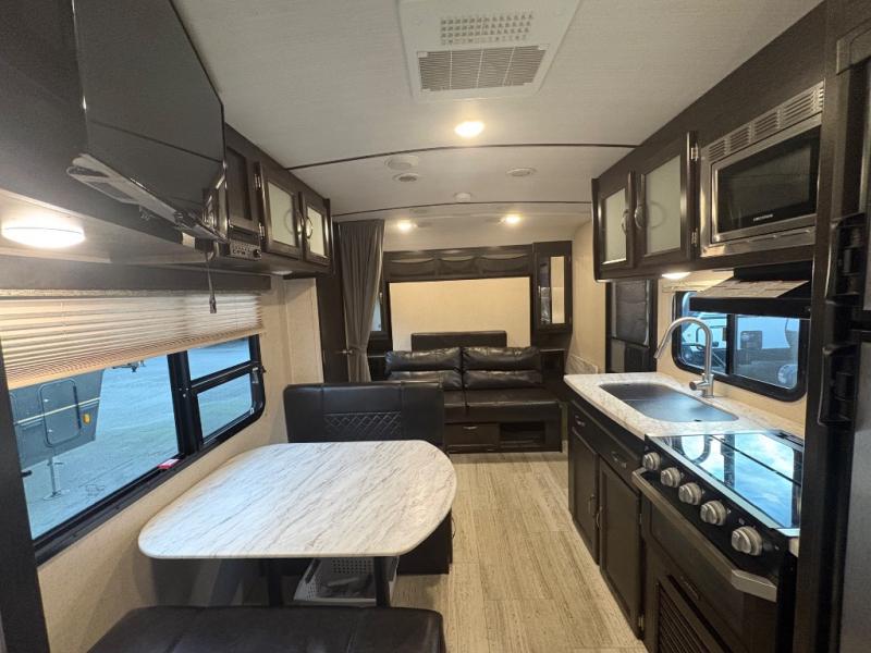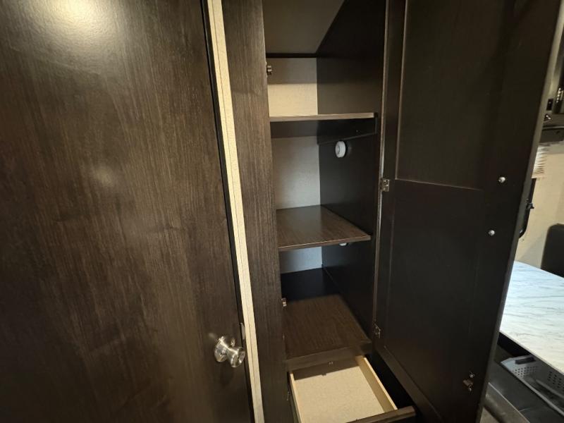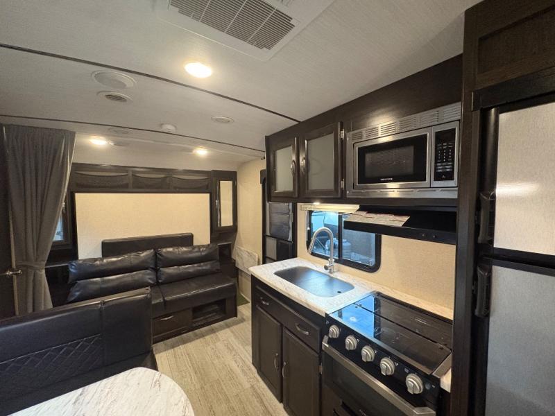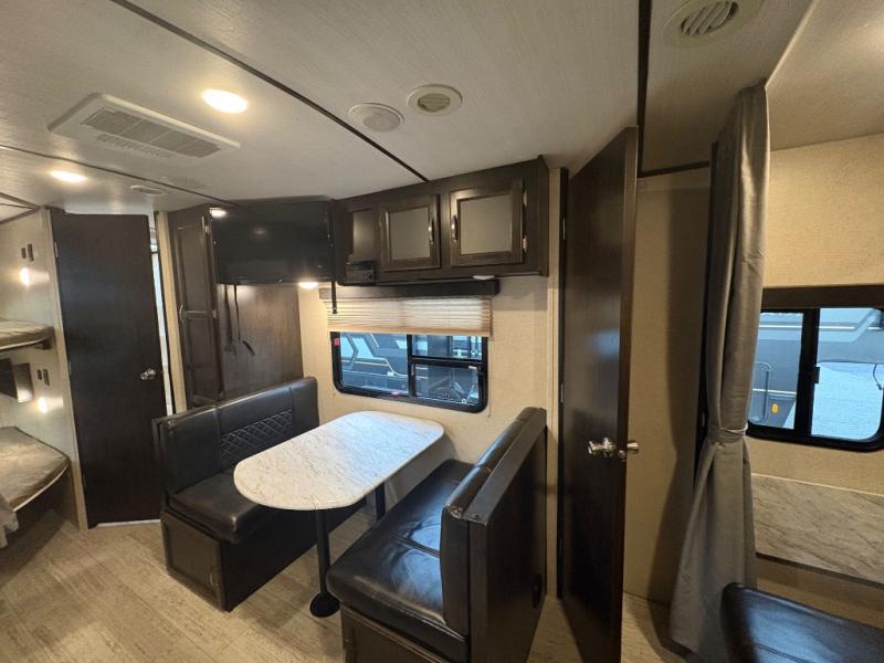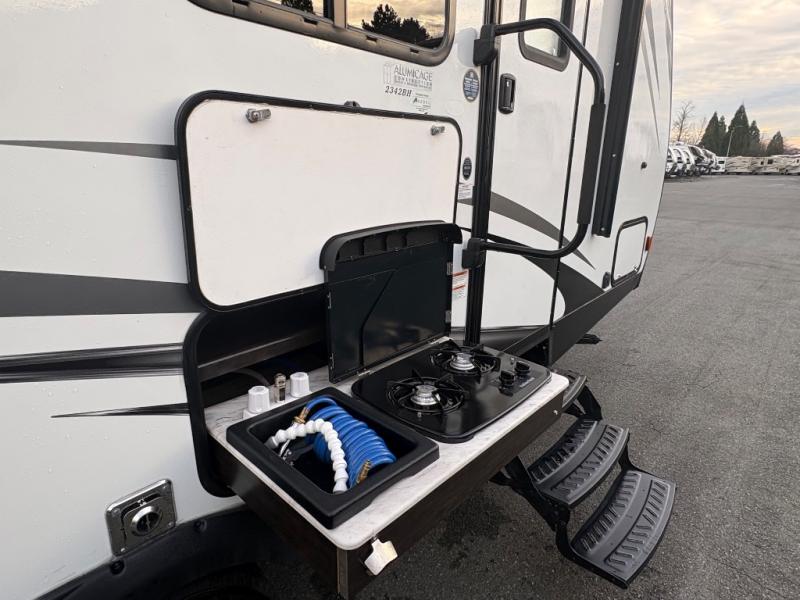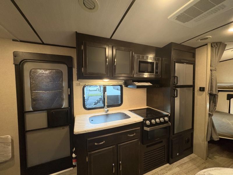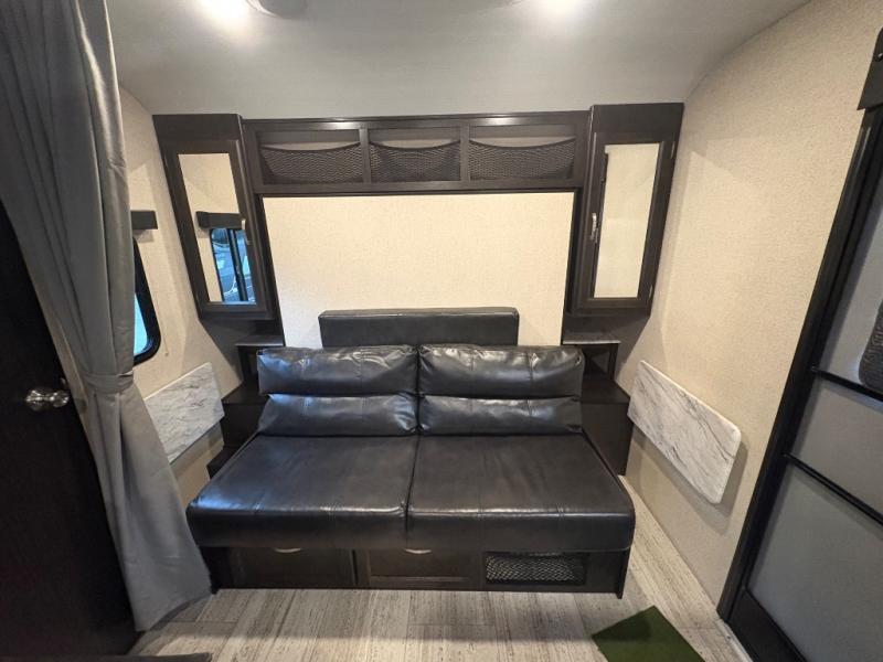 Load up the kids and head out to your greatest camping adventure in this 2245BH travel trailer! The front Murphy bed gives you versatile living with a sofa to sit on during the day and a bed to lay on at night, plus there is a pet center by it and a privacy curtain that can be drawn. The rear bunk beds are sure to be a crowd pleaser with your kids especially when they use the two convenience centers. Inside the rear corner bathroom you will find plenty of convenient features like the laundry hamper and the medicine cabinet. The chef of your group can choose to cook indoor or at the outdoor camp kitchen and enjoy their pets company with the exterior dog leash clip!