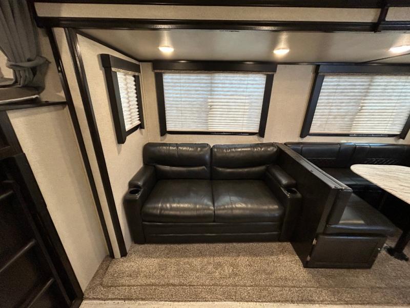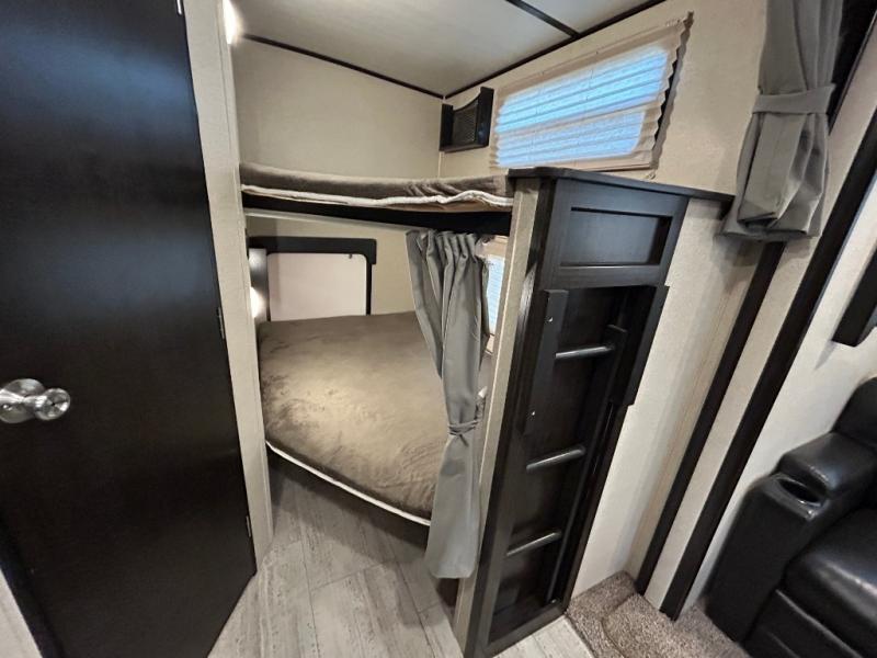 Your kiddos will love staying in this 2963BH travel trailer with the set of rear bunk beds which has two convenience centers for them and the lower bunk flips up too. You can easily access the rear corner bathroom from the outside with one of the two entrance doors leading right into it, and you can keep all of your dirty clothes in one place thanks to the laundry hamper in there too. The U-shaped dinette and sofa slide out provides extra walking around space while still providing a comfortable place to enjoy your meals and relax on at night!