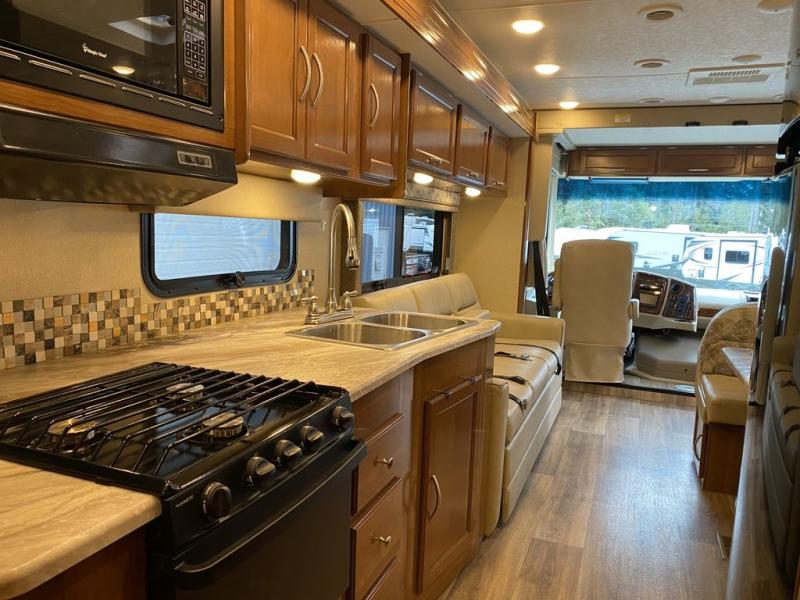 You will enjoy the journey when you have this much comfort surrounding you. This Coachmen Pursuit class A coach offers you a spacious interior with creature comforts just like home so you can explore until your heart's content! You will find a Mega-booth dinette where you can gather with family or friends and enjoy a meal, a conversation, or even a few games. There is also a 40" LED TV overhead for your viewing pleasure when inside. Above the cab seats, you will find a convenient drop-down bunk that is 47" x 81" which is perfect for the kids or an added guest. There is a cockpit table for your morning coffee, or a light snack while traveling.