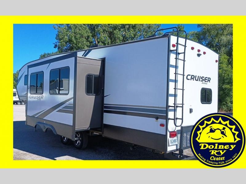 In any Cruiser Aire fifth wheel you will enjoy residential features and lightweight towing. These fifth wheels are all half-ton towable and designed to bring comfort and convenience to all of your adventures. A variety of floorplans make it easy to select the one that best meets the needs of your family, whether you desire more space for sleeping, more space to move about, or more space for the things you wish to take along. The kitchen is filled with stainless steel Furrion "Chef Collection" appliances, hardwood Maple cabinet doors, and 70 lb. full extension steel ball bearing drawer guides. On the outside, enjoy the painted front cap with Clear Shield for protection, a one piece seamless Super Flex roof with a 12-year warranty, plus exterior grade speakers, and an outside shower. The power awning with LED lights will also be a valued feature for those who love to spend as much time outside when camping. Come make your selection today!