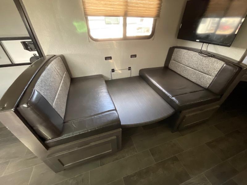 If you would like a comfortable and enjoyable weekend away with the family, then you need this Sunset Trail Super Lite travel trailer. Because of the set of double bunk beds, booth dinette, and Murphy bed, this unit has the ability to sleep seven people, and since the Murphy bed is adjustable, you can fold it away during the day and simply enjoy the room to gather together on the sofa. If you look forward to watching the sun rise each morning, you will be thrilled to spend your time cooking breakfast at the outdoor kitchen as you take in the view and sip your coffee.
