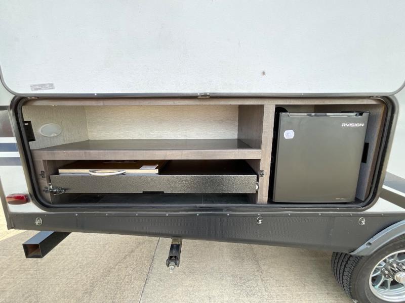 The exterior of the CrossRoads Sunset Trail Super Lite travel trailer is completely sleek and modern looking with its tinted windows that help protect your interior decor from fading and its painted fiberglass front cap that curves over to the roof and delivers a more aerodynamic approach. However, you will enjoy spending your evenings outside of the Sunset Trail for more reasons than just the appealing exterior vibe because each unit comes equipped with an electric awning with LED lights and outdoor speakers which create the perfect place to host a late-night get together with friends.