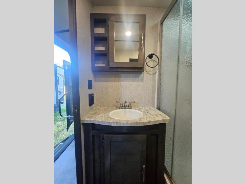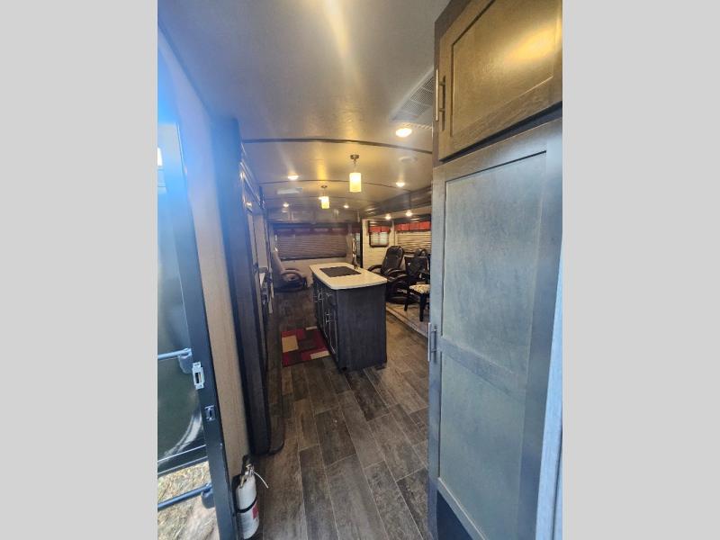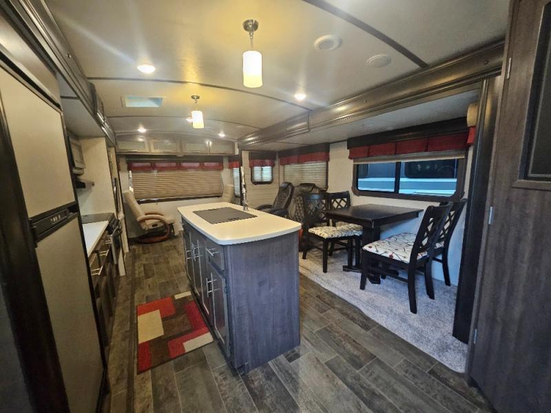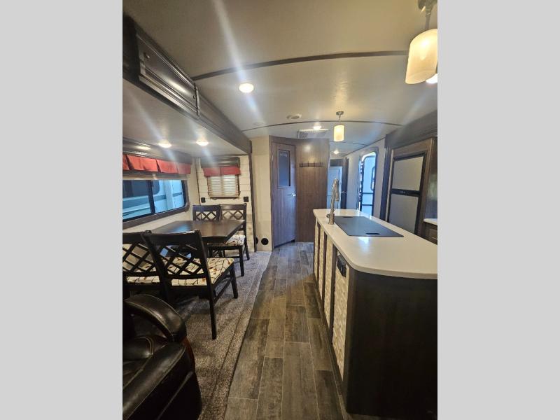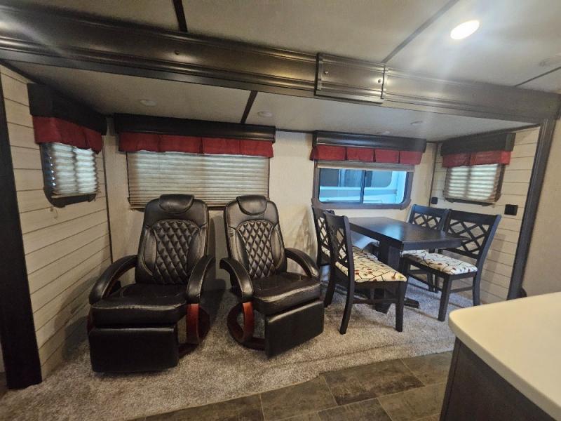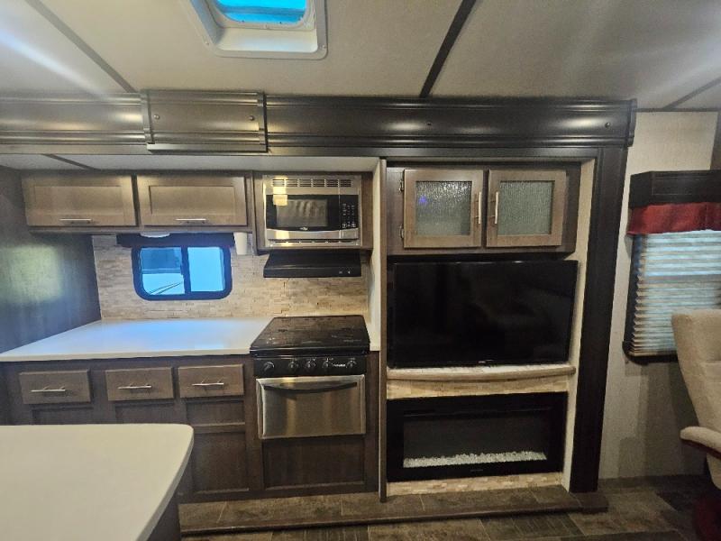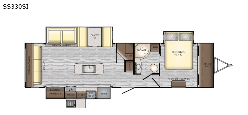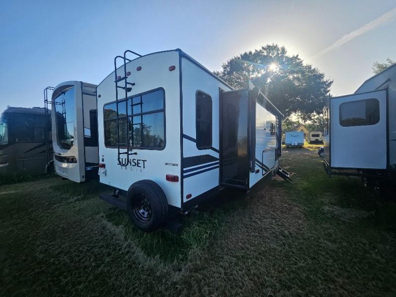 If you are looking for an all-inclusive unit, look no further than this Sunset Trail Super Lite travel trailer! From the three slides to the master suite, this unit delivers comfortable elegance all throughout. As you chop veggies or wash dishes, you will appreciate the kitchen island for the extra countertop space that it provides, and the large pantry will help you store all of your favorite spices and snacks. You will look forward to the evening time when you can lounge on the 82" sofa or theater seating as you warm up next to the fireplace.