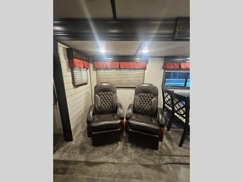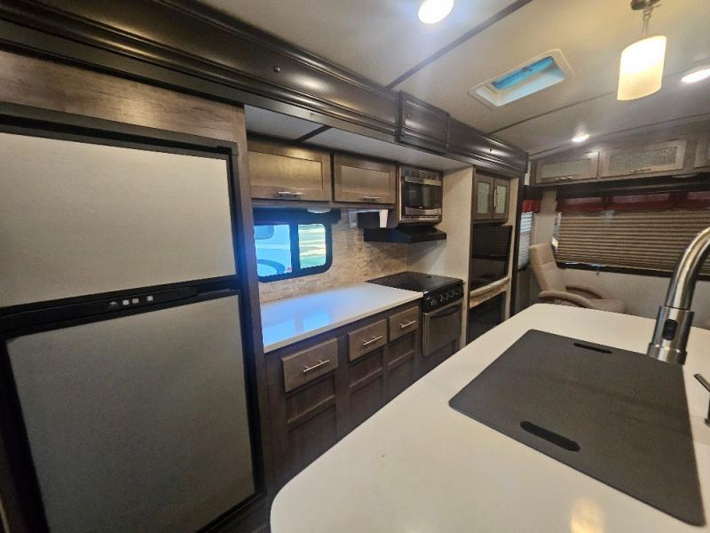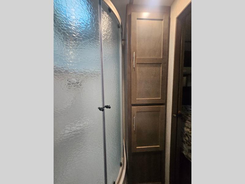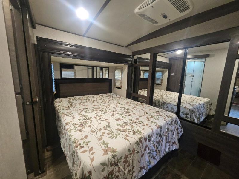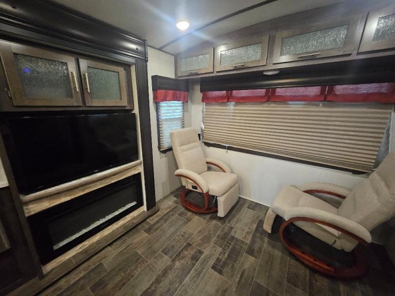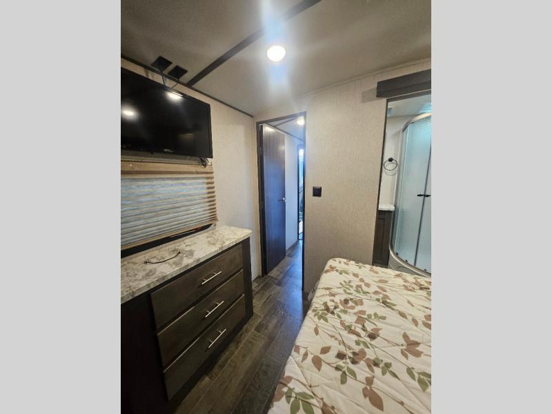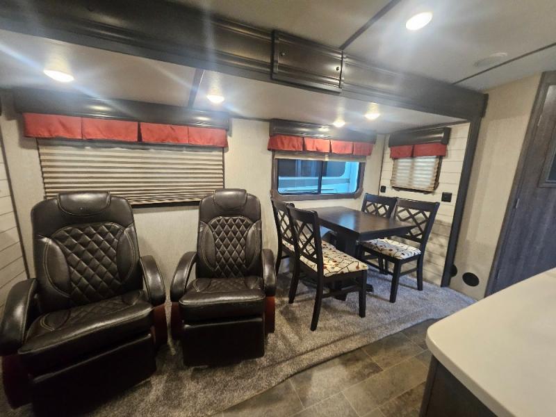 If you are looking for an all-inclusive unit, look no further than this Sunset Trail Super Lite travel trailer! From the three slides to the master suite, this unit delivers comfortable elegance all throughout. As you chop veggies or wash dishes, you will appreciate the kitchen island for the extra countertop space that it provides, and the large pantry will help you store all of your favorite spices and snacks. You will look forward to the evening time when you can lounge on the 82" sofa or theater seating as you warm up next to the fireplace.