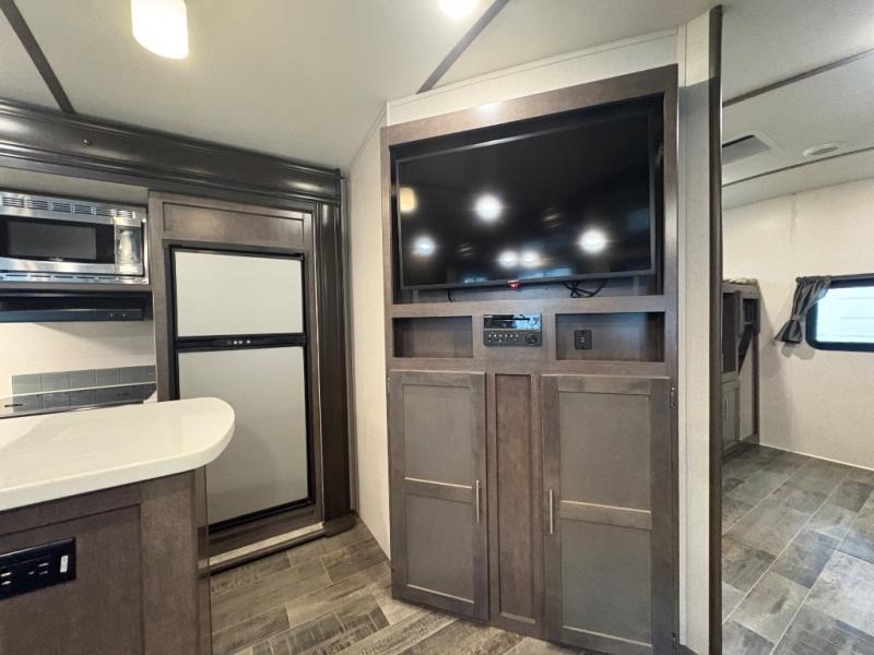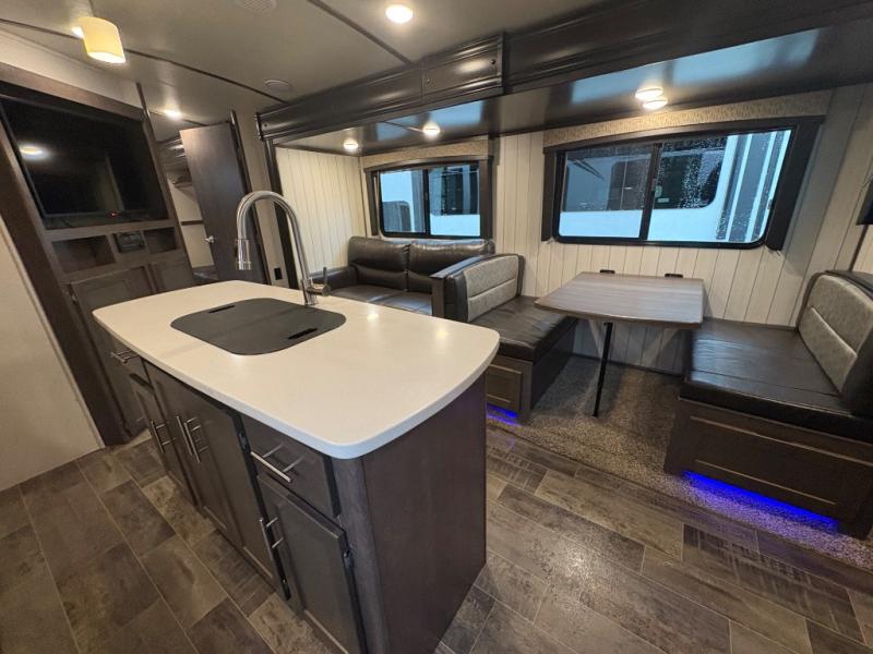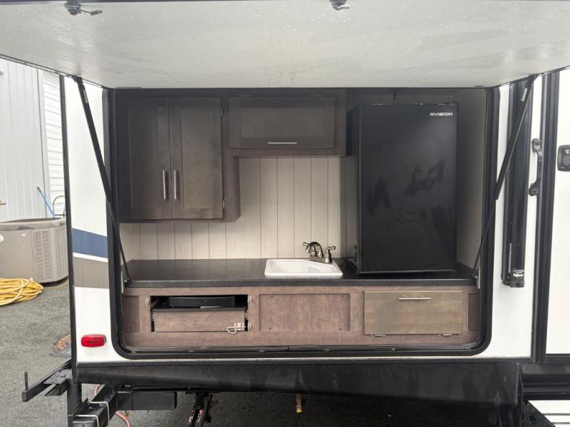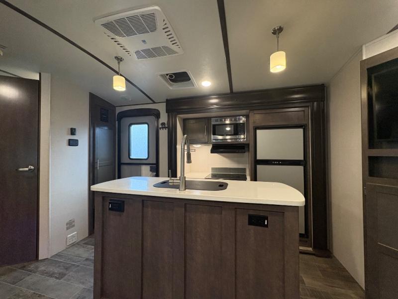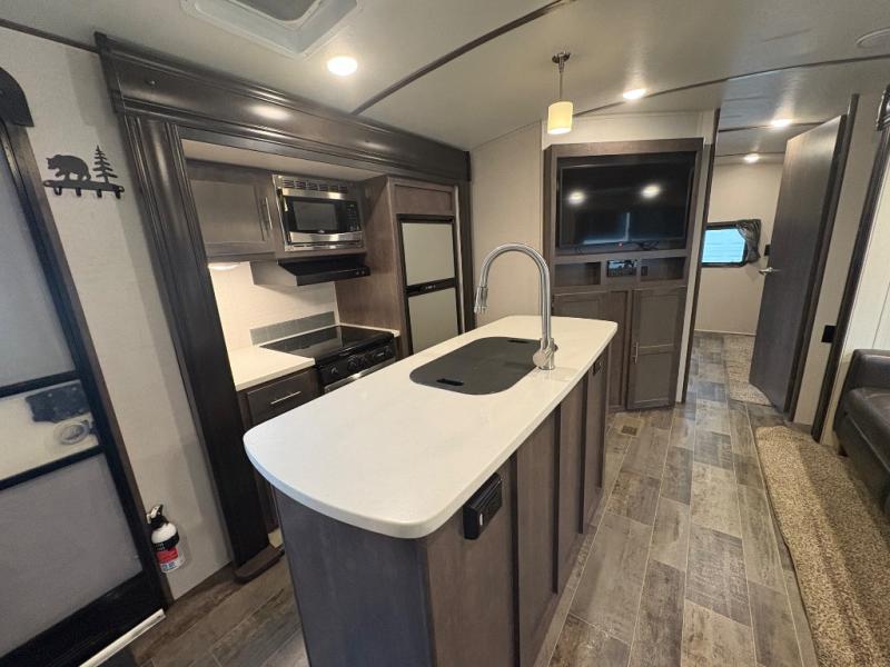 If you are looking for an all-inclusive trailer with classy, updated amenities, then this Sunset Trail Super Lite travel trailer is precisely what you need. With its ability to sleep nine people, this unit gives you space where you need it most, and the fully stocked kitchen, along with its own island countertop and outdoor kitchen, allow you to comfortably prepare all of your meals for this big group while traveling on the road. The two entry doors that have been included in this unit permit you access into either the kitchen or half bathroom, and the large walk-through bathroom leads directly into the front, private bedroom.
