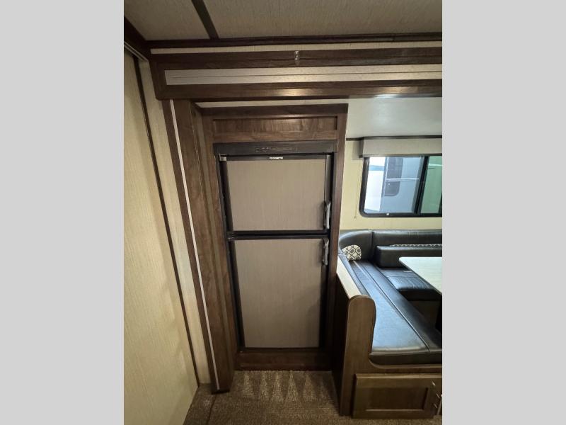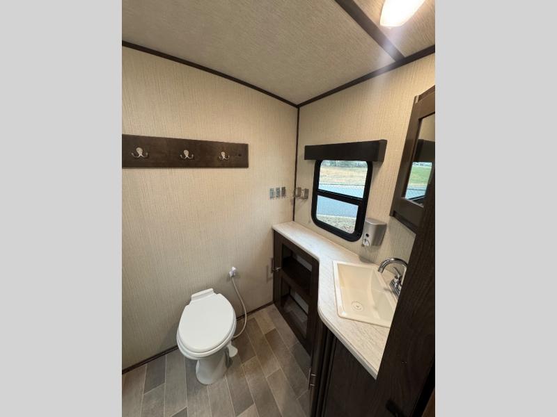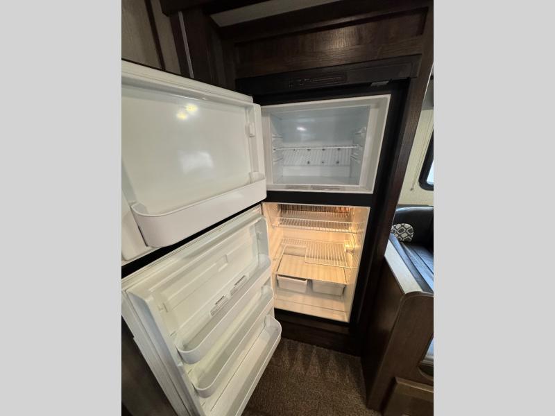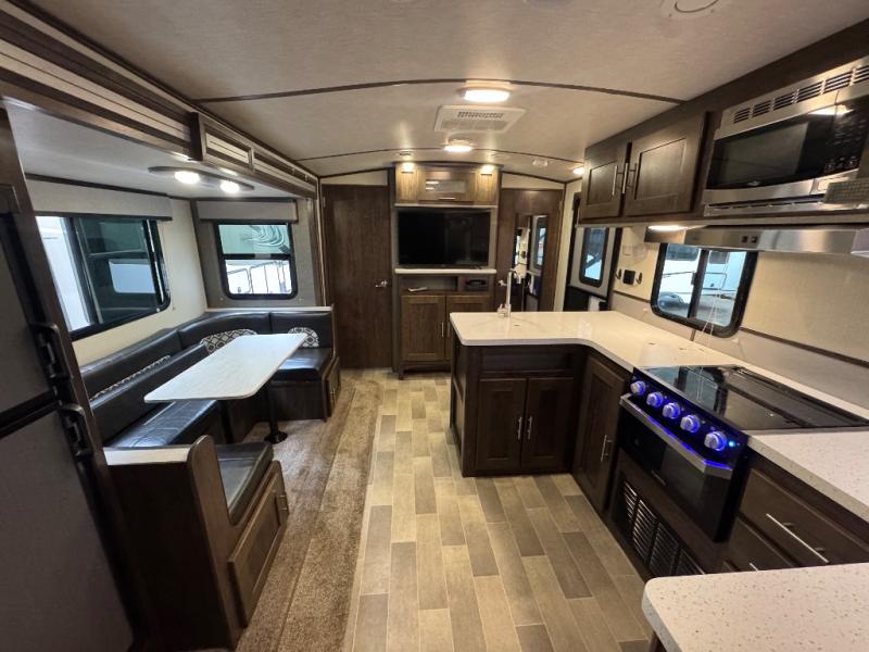 This unit is the perfect couples trailer you'll enjoy as you camp at your favorite state park. Within the slide out, the U-shaped dinette is great to enjoy dinner around and can also be used for additional sleeping space. After a long hike, clean up in the full rear bath, and relax on the king bed at the front of the trailer. the U-shaped counter in the kitchen offers everything at your fingertips, including a built-in trash location.