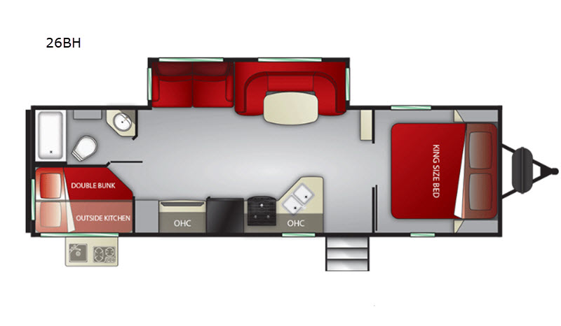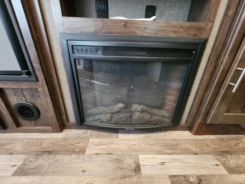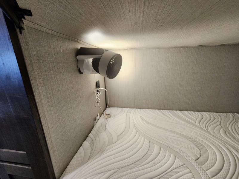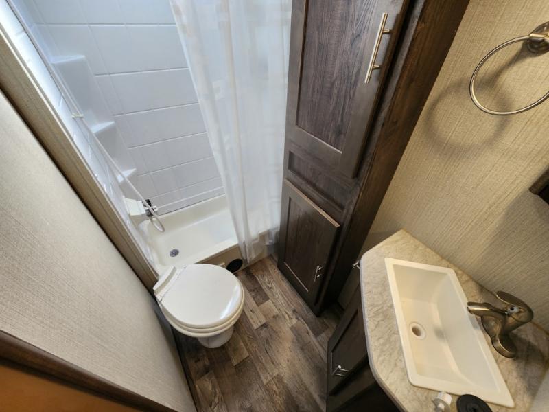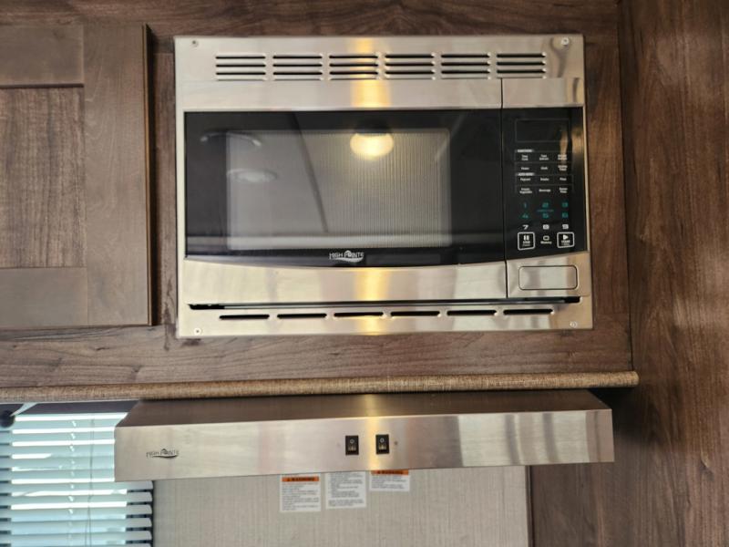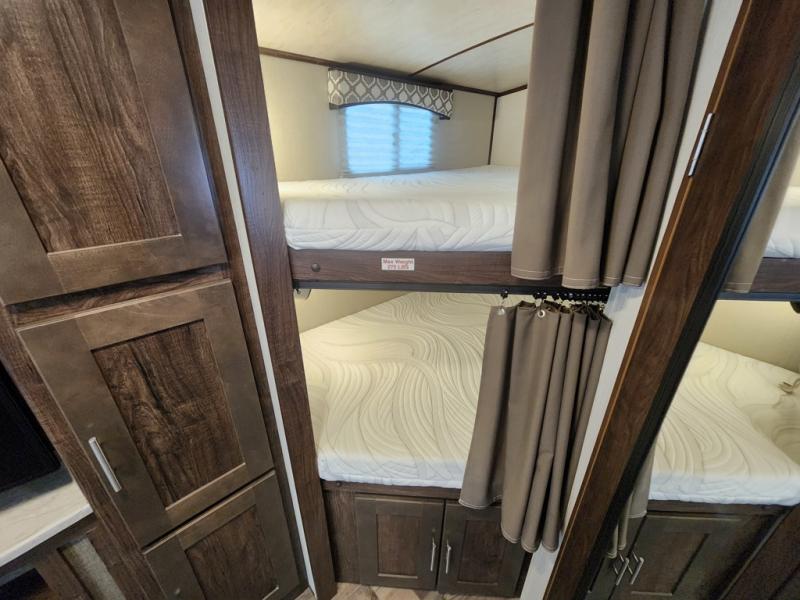 Your family will love to camp in this travel trailer, and with room for ten, you can invite the grandparents and the cousins! The double bunk beds are just the right size for the kids, while mom and dad can enjoy the king bed in the front private bedroom. You'll also find sleeping arrangements on the tri-fold sofa and the U-shaped dinette once folded down. This unit features an outside kitchen, so you can enjoy more time outdoors, plus there is an awning with an LED light so you can stay out late and talk. The full bath in this trailer makes cleaning up after a long day easier than ever.