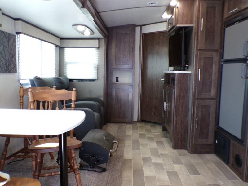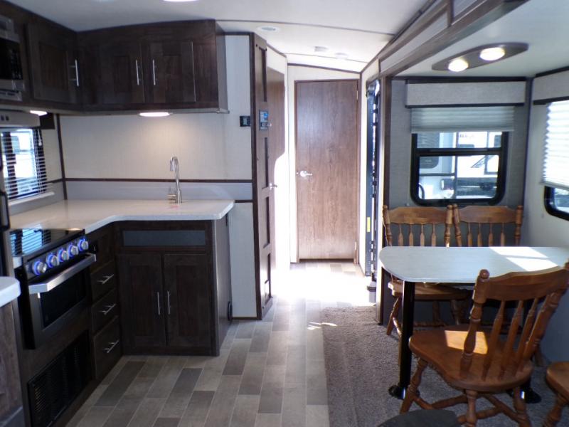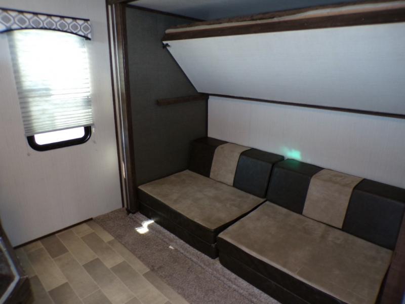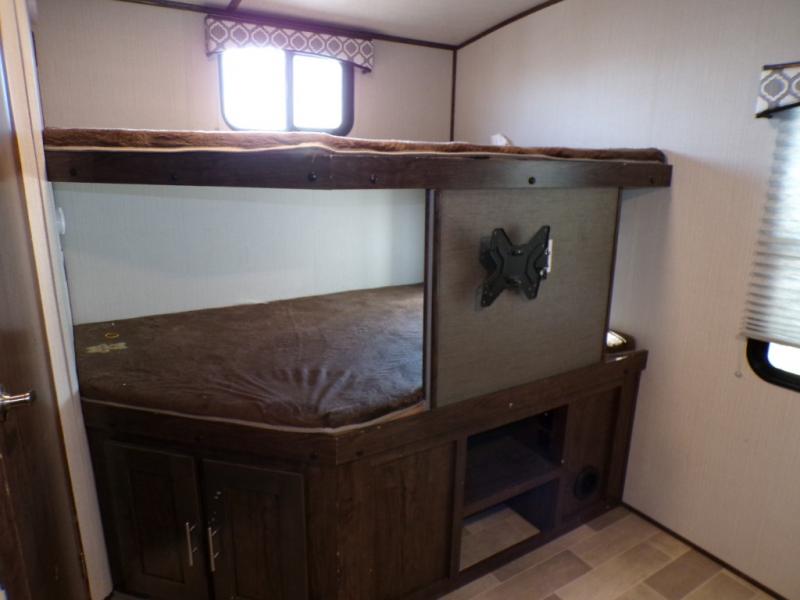 Bring the whole family along with room for nine in this travel trailer. You can invite the grandparents and the cousins! The private bunkhouse provides the kids a place to call their own. Mom and dad will appreciate the king bed in the front private bedroom and their own door into the double entry bath. This unit features a full bath, plus a half bath right next to the bunkhouse for the kids. Everyone can meet outside to visit with friends, relax around the campfire, and cook on the outside kitchen. This model will provide years of memories for you and your family.