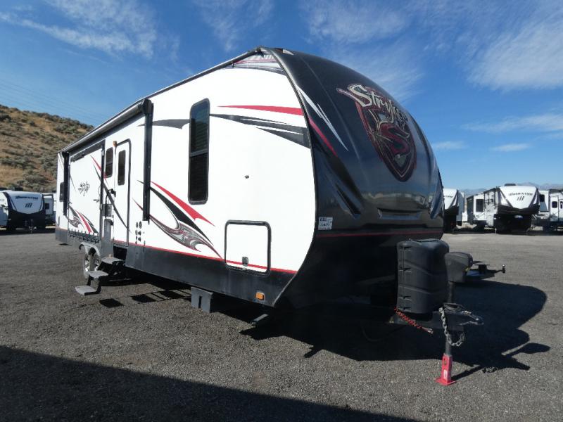 The Stryker toy hauler by Cruiser RV is all about family fun! With its functionality, design, and innovation, the Stryker was created with you in mind, and because the Stryker has a wide-body foundation, you will be able to bring along your biggest off-road toys. With deluxe additions like the residential furniture and designer accent walls, the interior portion of the Stryker is just as breathtaking as the high-gloss premium fiberglass exterior.