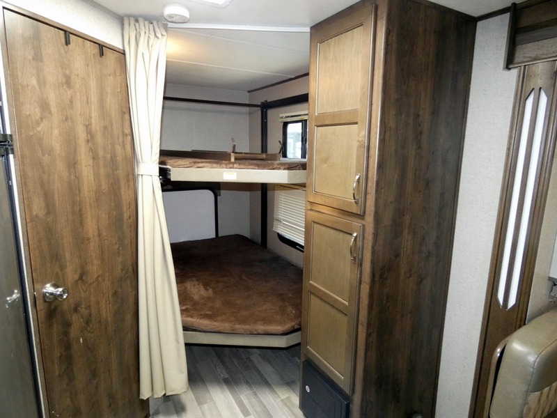 This dual-entry Dutchmen Aerolite travel trailer will provide sleeping space for seven with the rear Happi Jac power bunks, the front queen-size bed, and the booth dinette that sits inside of the single slide. You can rinse off after a muddy outdoor trek with the outside shower before coming inside to completely clean up in the full bathroom, and because the bathroom contains one of the two entry doors, you will have quick access in and out. The kitchen provides all the appliances needed to make plenty of scrumptious meals throughout your trips with its glass top three-burner range and 21" oven. You are sure to appreciate the exterior Pac-N-Play door that allows you to store items under the bunks, and the pass-through storage compartment up front will let you bring along large camping equipment.