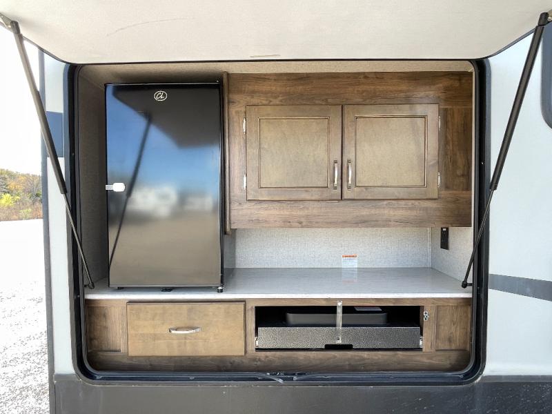 You will love every trip you take with the family in this Aerolite travel trailer! From the rear full bathroom with a radius shower to the front private bedroom with a queen-size bed, this unit gives you privacy where you want it most. You will also enjoy having the option to prepare dinner inside with the full kitchen or outside in the fresh air with the outdoor kitchen, and when the leaves begin to fall and the air turns crisp, you will enjoy cuddling up on the tri-fold sofa in front of the fireplace as you watch your favorite movie on the LED HDTV before bed.