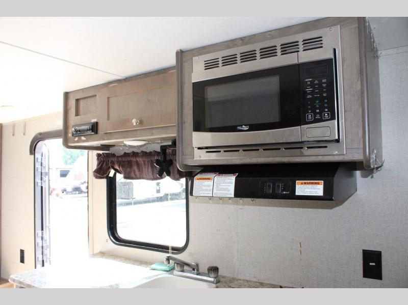 Dreaming about throwing out the tent and stepping up to this Aspen Trail LE Series travel trailer? Just imagine how perfect this model will fit your lifestyle of traveling to your favorite campgrounds each chance you get. From a comfortable queen-size bed with a nightstand and wardrobe to a full kitchen with the tools needed to make meals for yourself and your guests, you can enjoy the great outdoors after sleeping above ground. No more worries about the rainy weather because you can relax inside at the U-shaped dinette, and you can skip the park's restrooms thanks to the full bathroom.
