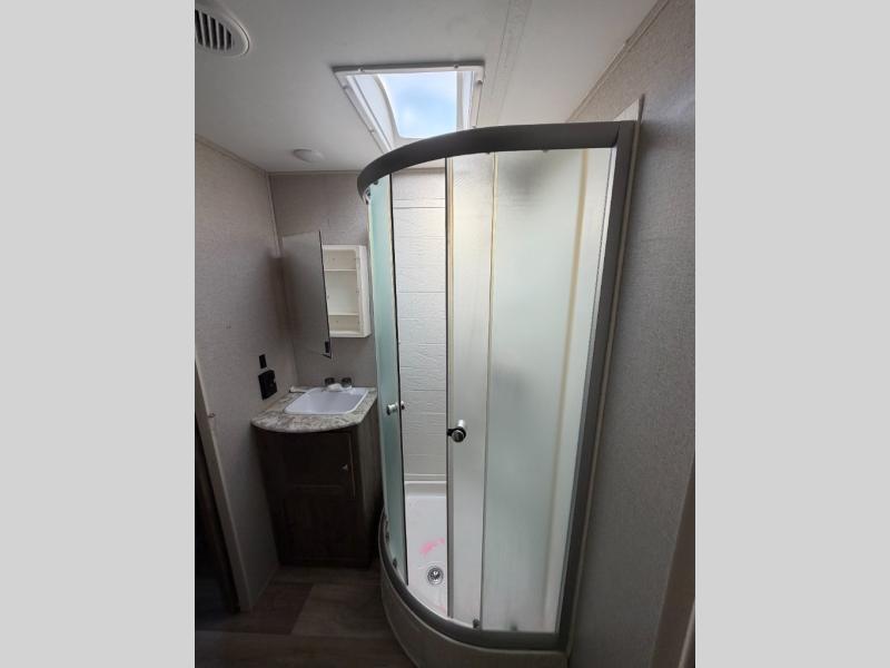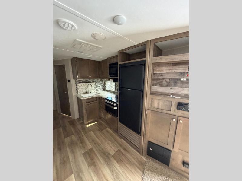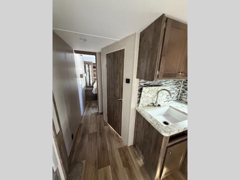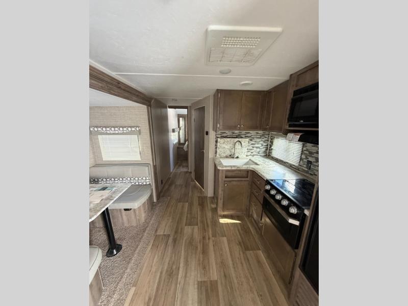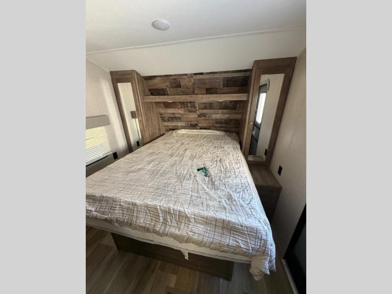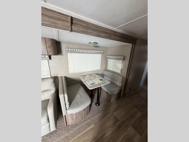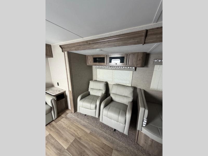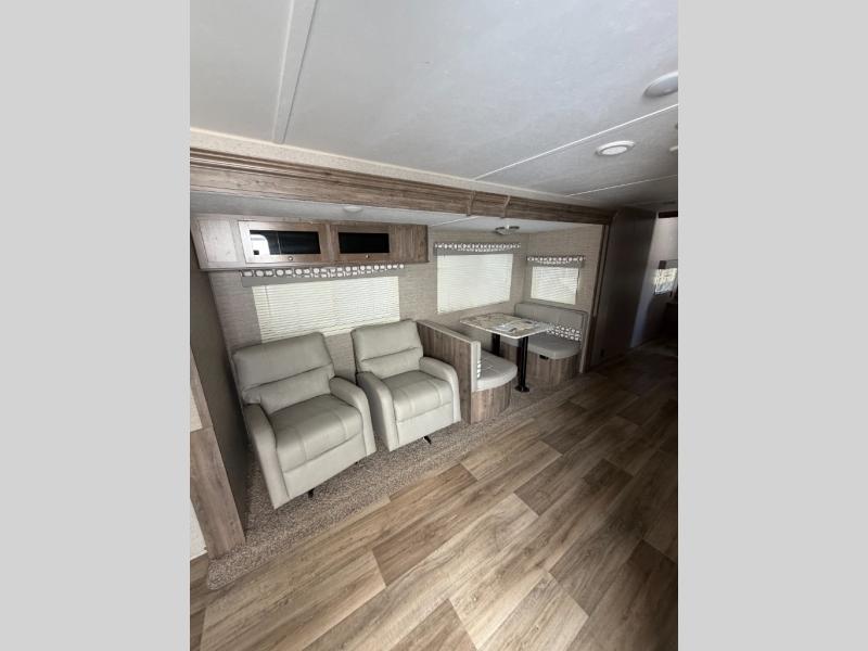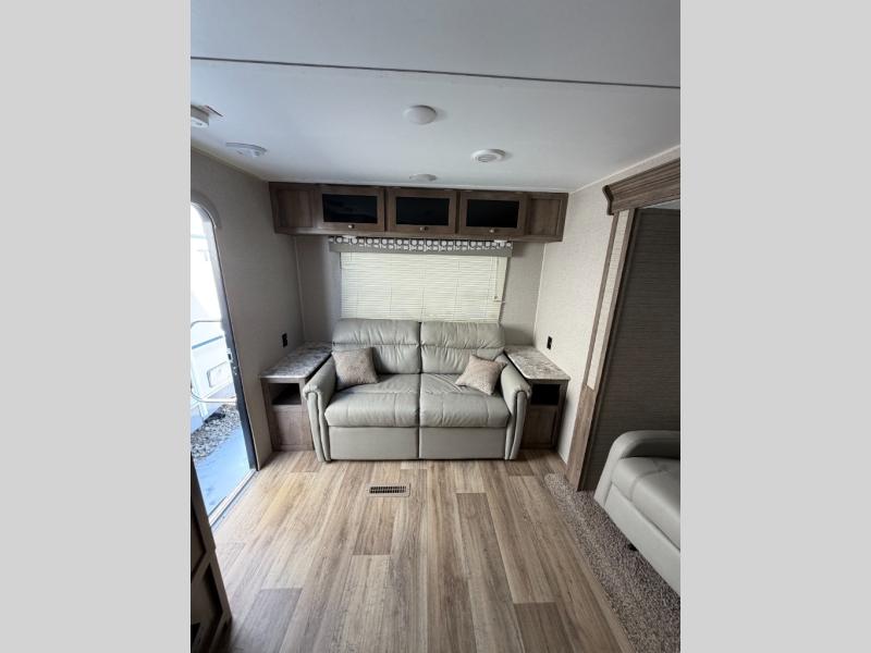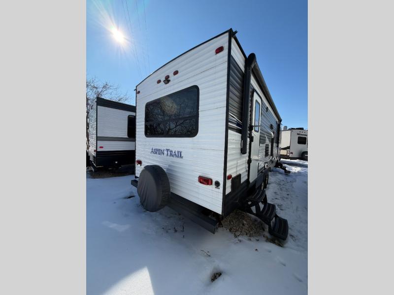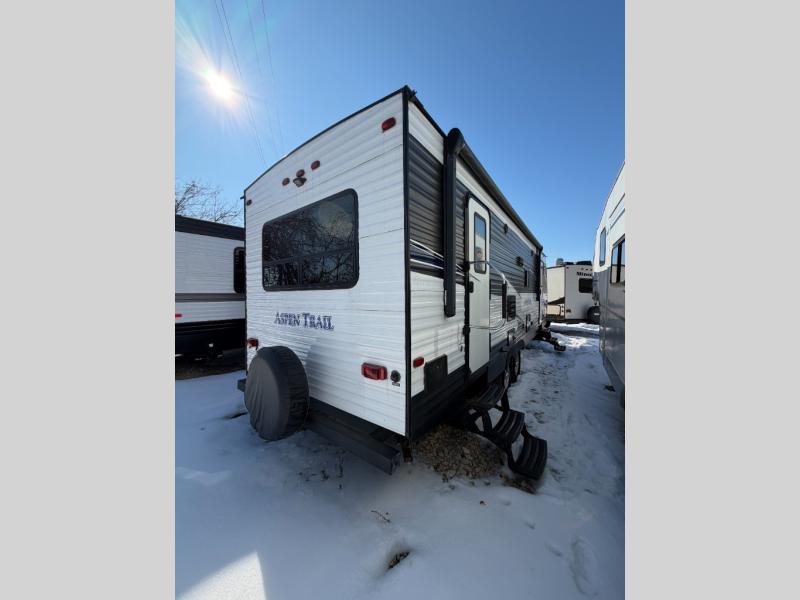 Daydreaming about finding the perfect couple's travel trailer? This Aspen Trail travel trailer might just be the one! Start thinking about which side of the bed you will choose, the one with the second exterior entry nearby or the one closest to the interior sliding bedroom door. You might even sneak outside to go fishing while your spouse gets ready for shopping in town, or both of you might decide to drink your coffee while sitting in the main living area on one of the two recliners or the rear sofa. If you decide to invite overnight guests, the booth dinette and sofa also provide extra sleeping space.