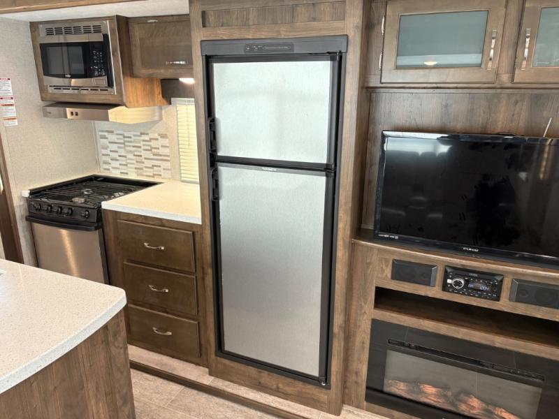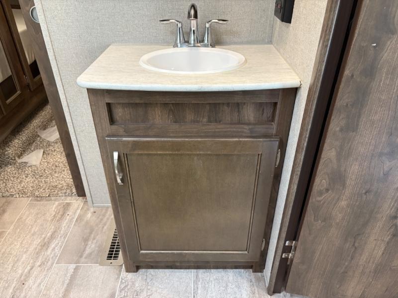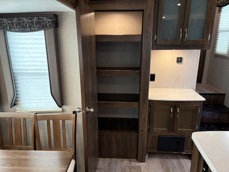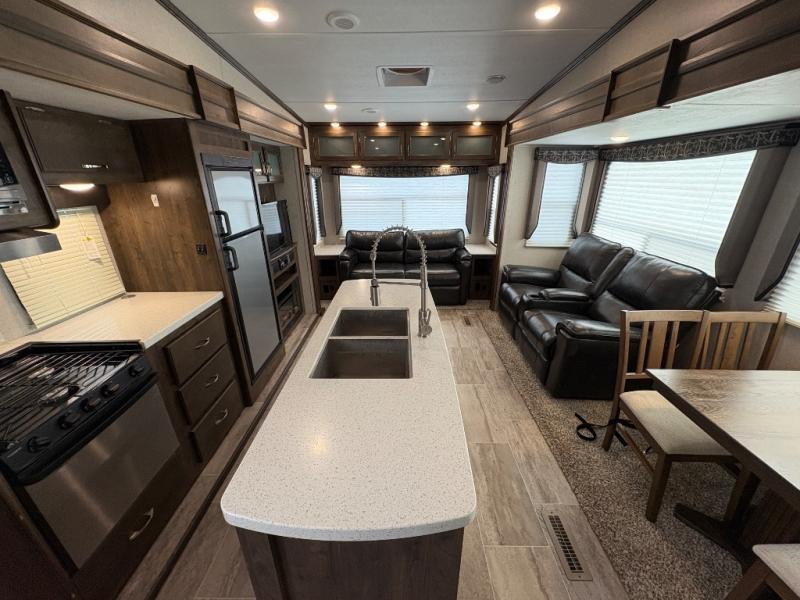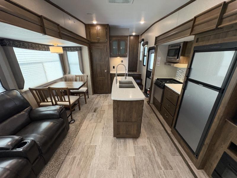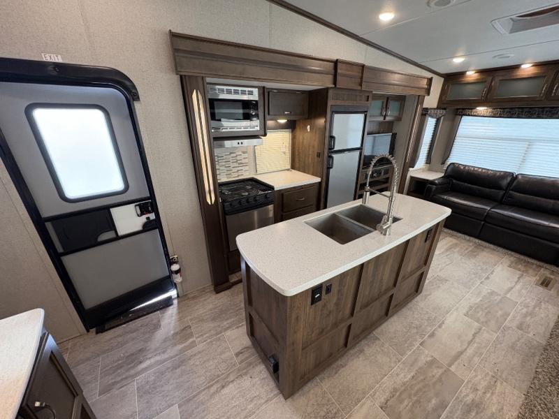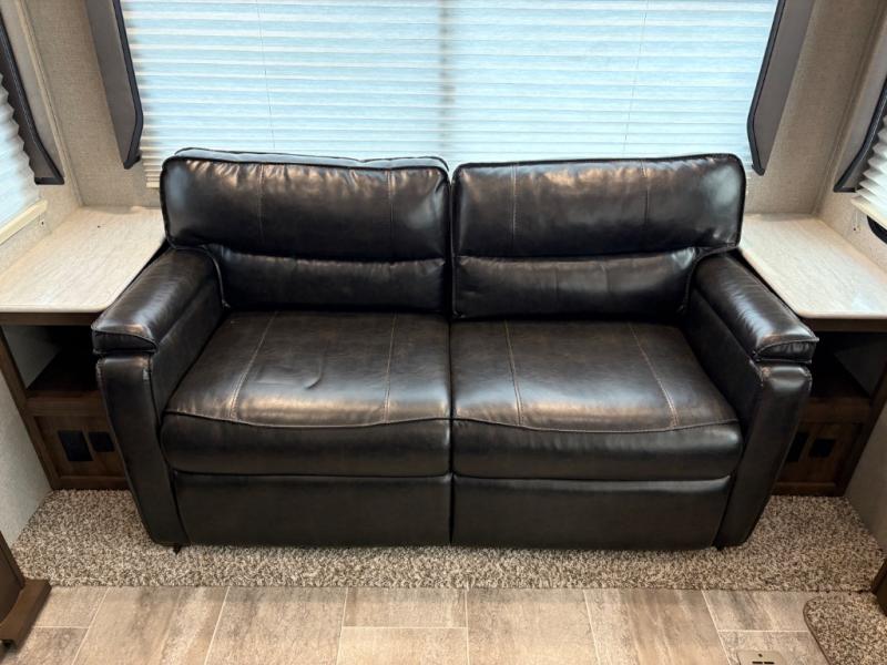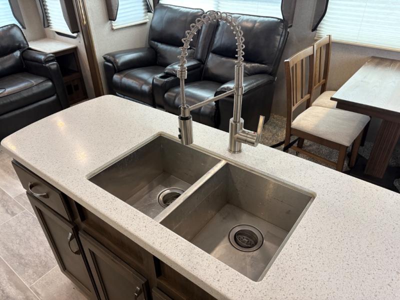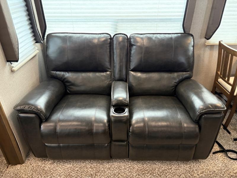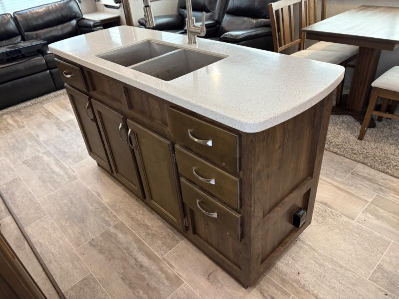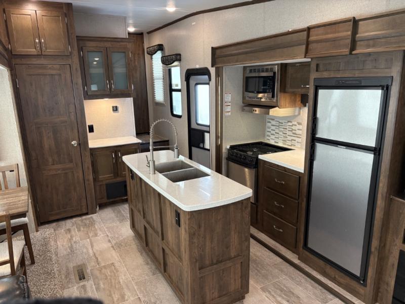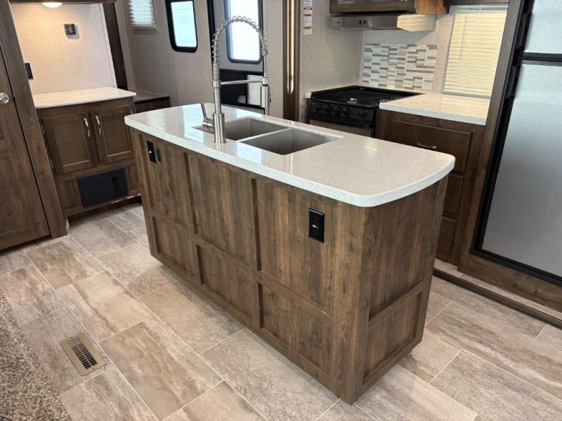 How does dual slide outs in the main living and kitchen area, and a single slide out in the bedroom sound in your next fifth wheel. This spacious RV also includes a kitchen island to prepare and serve meals, as well as wash dishes all while visiting with the whole gang. There are several furniture seating choices such as the popular theater seats for two, or optional free standing dinette with chairs. And the dual entry bathroom provides a convenience you didn't even know you needed but you will love it! Step inside to find even more comfortable and luxurious features you will want when traveling.