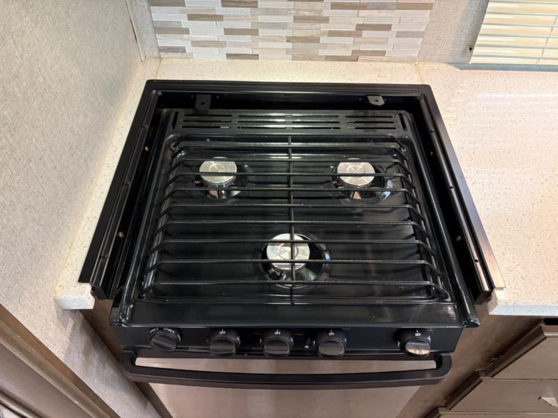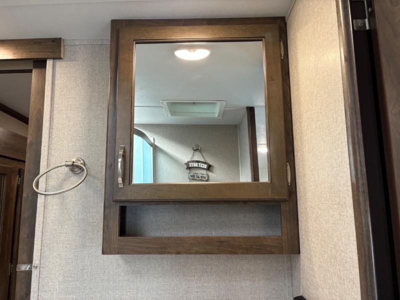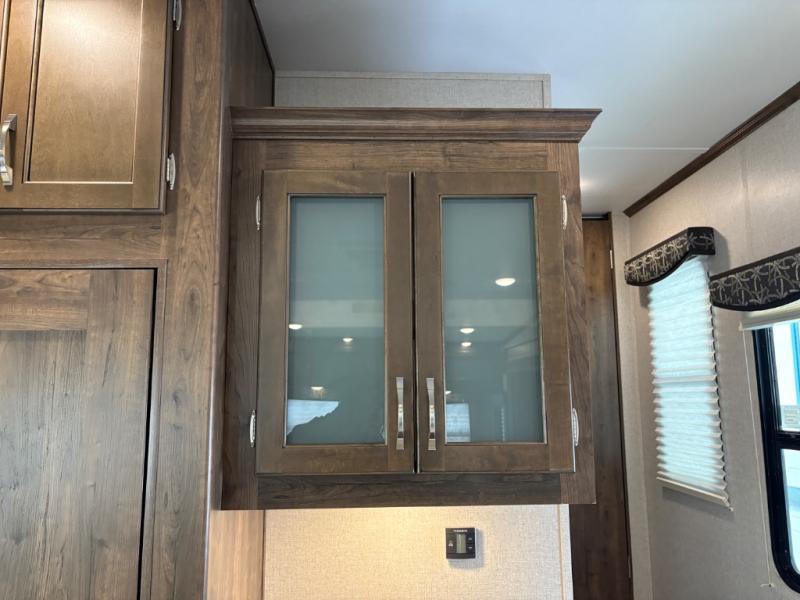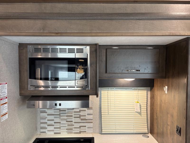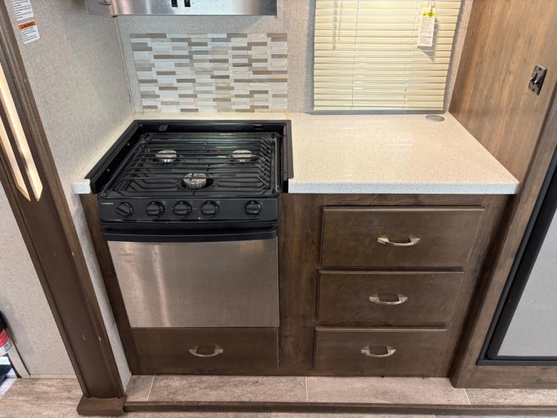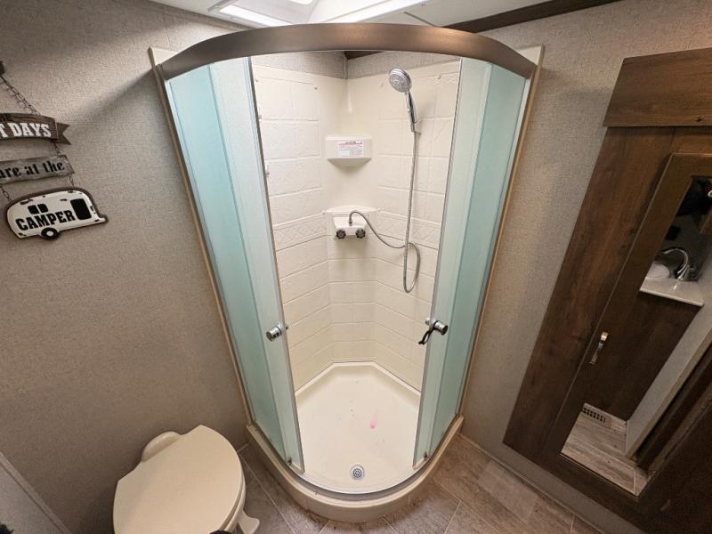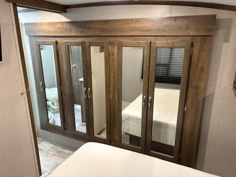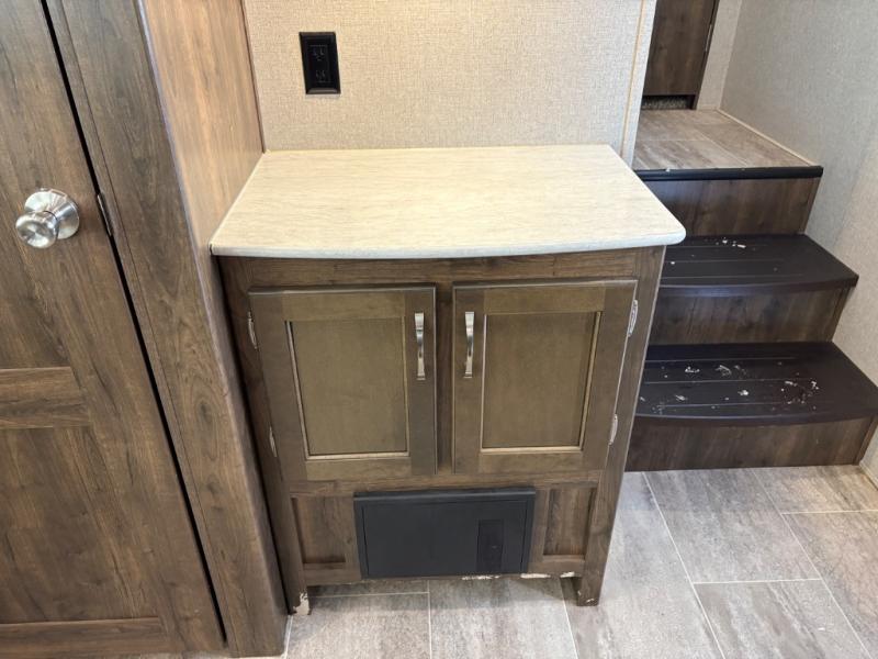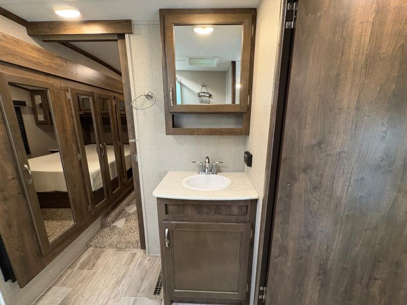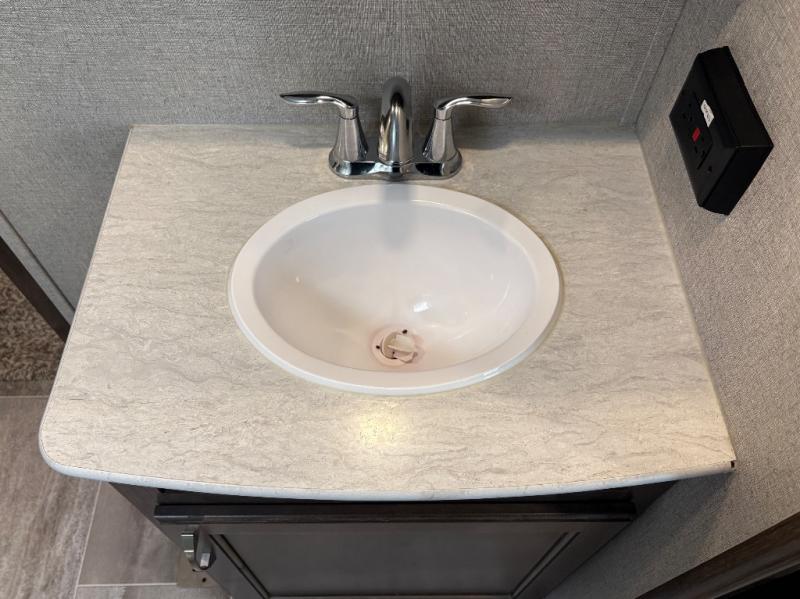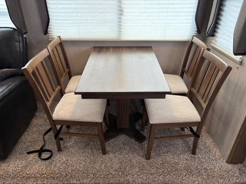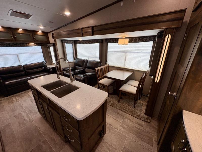 How does dual slide outs in the main living and kitchen area, and a single slide out in the bedroom sound in your next fifth wheel. This spacious RV also includes a kitchen island to prepare and serve meals, as well as wash dishes all while visiting with the whole gang. There are several furniture seating choices such as the popular theater seats for two, or optional free standing dinette with chairs. And the dual entry bathroom provides a convenience you didn't even know you needed but you will love it! Step inside to find even more comfortable and luxurious features you will want when traveling.