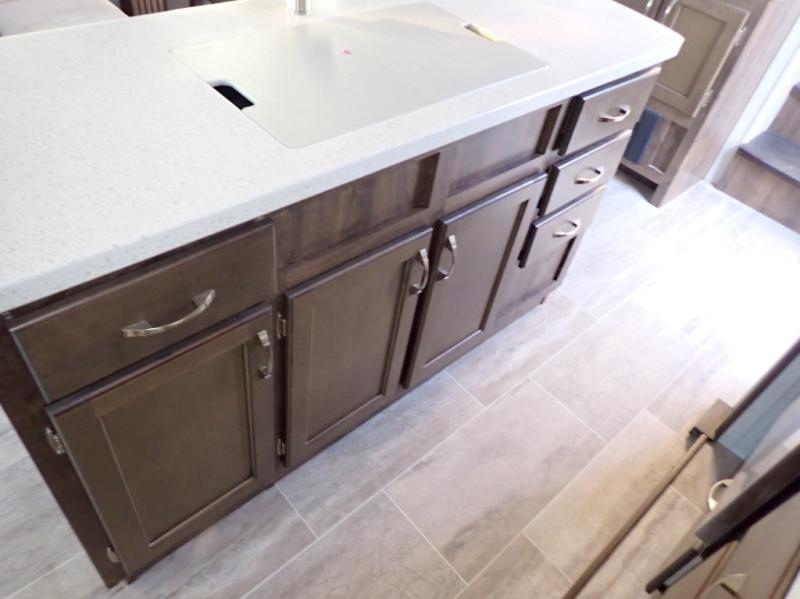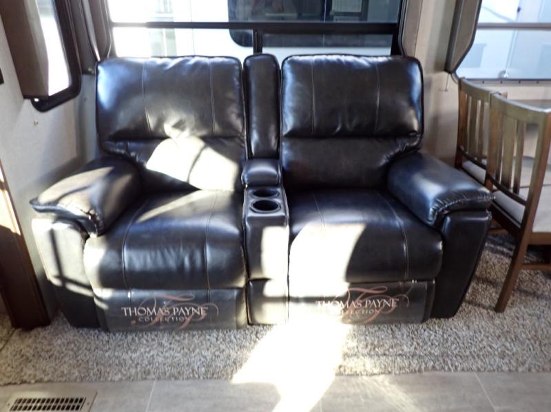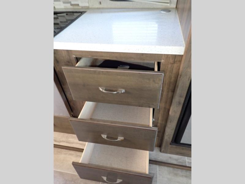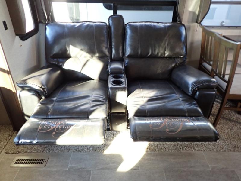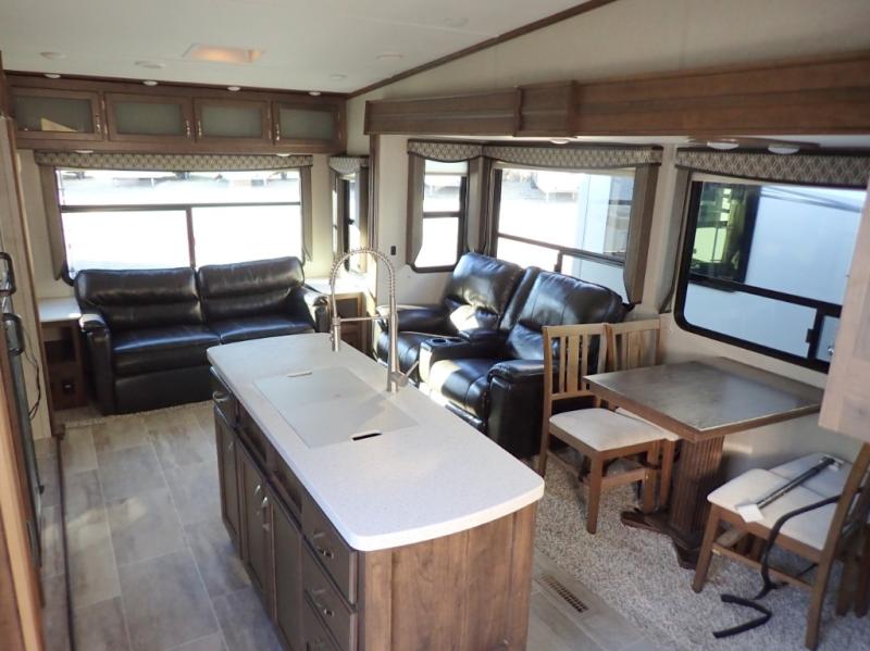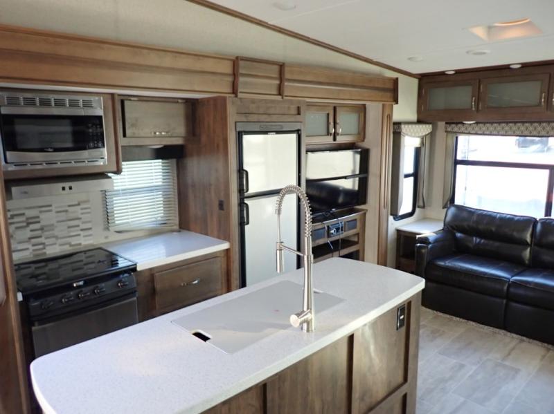 How does dual slide outs in the main living and kitchen area, and a single slide out in the bedroom sound in your next fifth wheel. This spacious RV also includes a kitchen island to prepare and serve meals, as well as wash dishes all while visiting with the whole gang. There are several furniture seating choices such as the popular theater seats for two, or optional free standing dinette with chairs. And the dual entry bathroom provides a convenience you didn't even know you needed but you will love it! Step inside to find even more comfortable and luxurious features you will want when traveling.