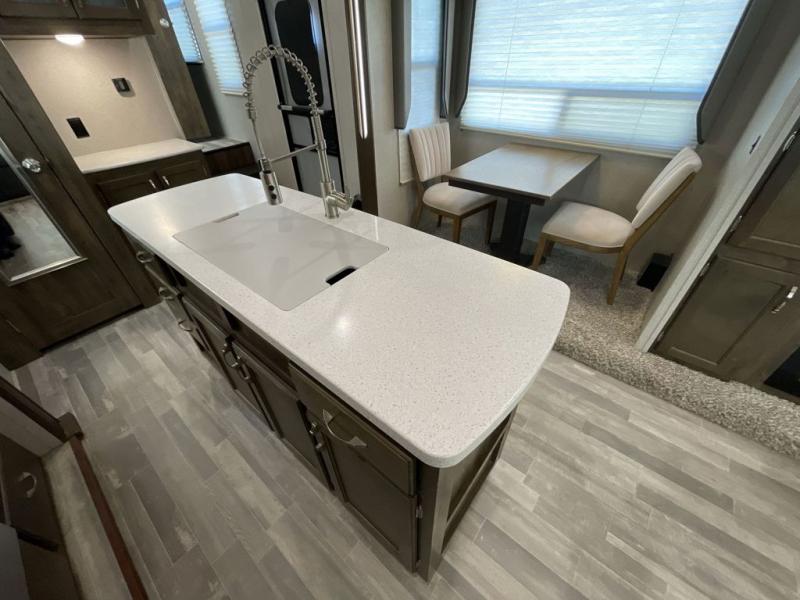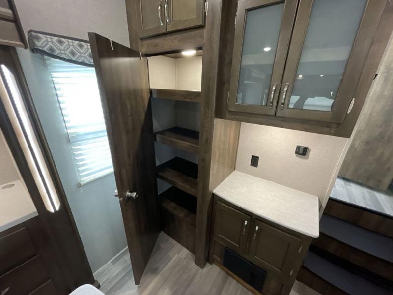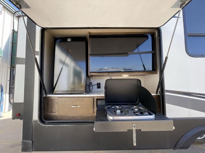 When the outdoors is calling you to adventure, this Astoria is ready to answer! You will find a spacious interior with triple slides including dual opposing slides in the main kitchen/living area. You will love the center island for meal prep and serving, and the double sink facing into the unit makes it easy to be part of the conversation going on while you are preparing meals or cleaning up. A large pantry, overhead storage, and curio cabinet each offer plenty of room for your things. A front private bedroom also provides much needed storage with a slide out wardrobe/linen cabinet for all of your needs. On the outside, create meals and snacks easily while enjoying the fresh air with the outdoor kitchen.