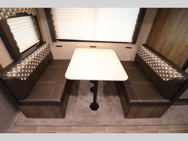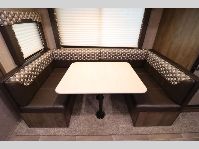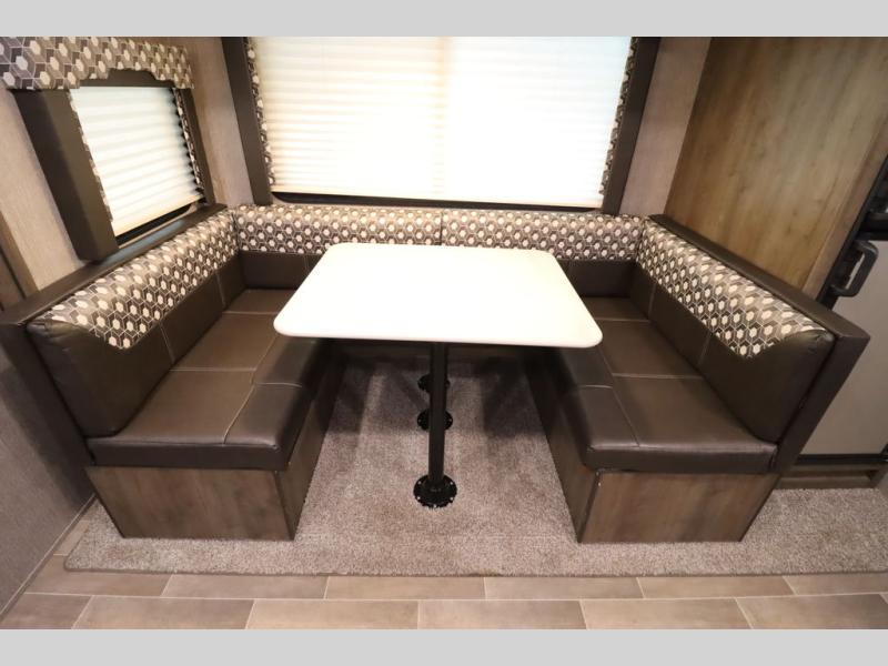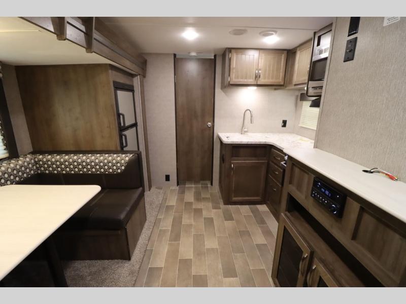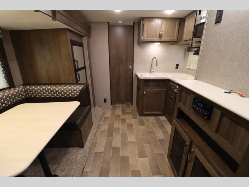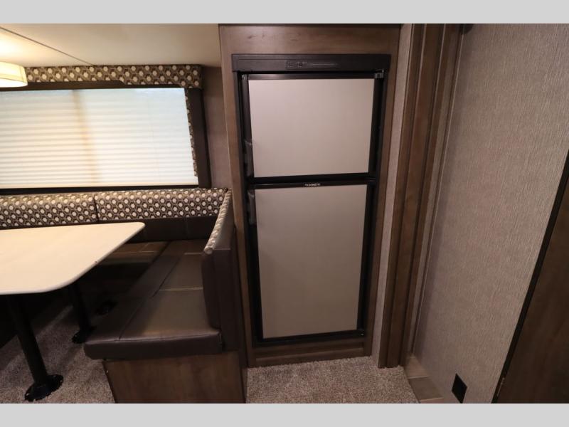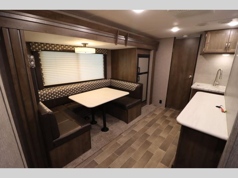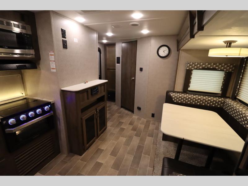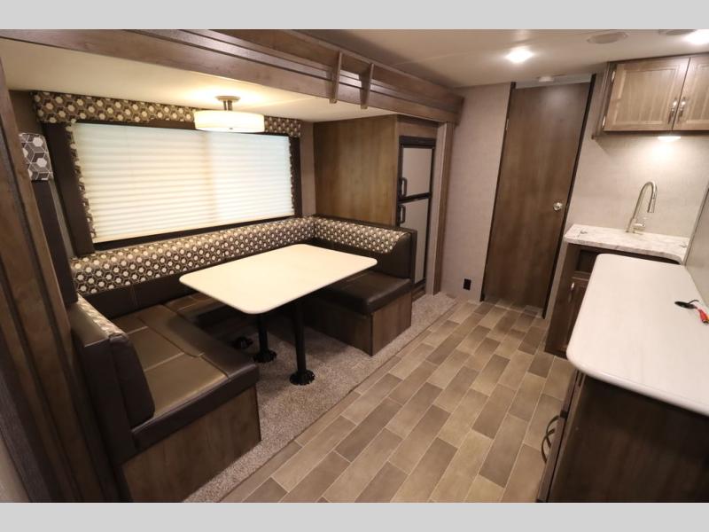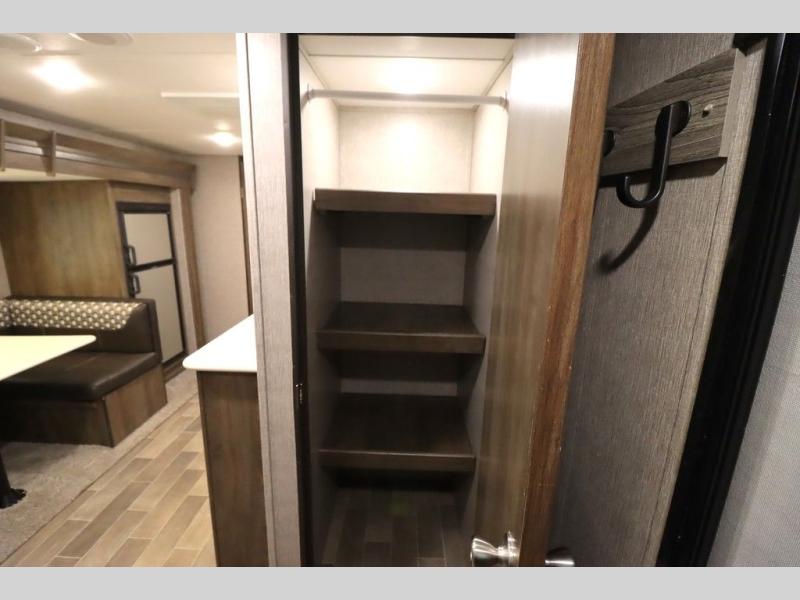 Step inside this travel trailer with a single slide for a fun and relaxing getaway with family. The U-shaped dinette is perfect for meal times and can also be used for additional sleeping space once folded down. You will enjoy the front private bedroom that features a queen Rest Easy mattress, and nightstands on both sides of the bed. This unit includes a three burner range to cook a meal just like you do at home, and plenty of counter space. As soon as you enter the trailer, you'll find a pantry and a walk-in closet with shelves that is perfect for shoes and jackets.