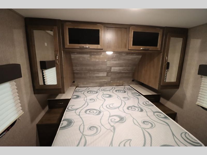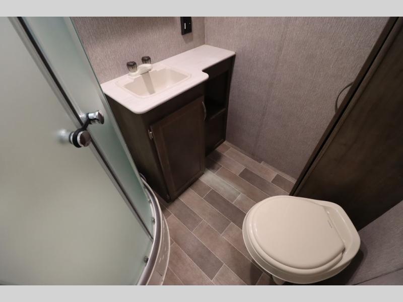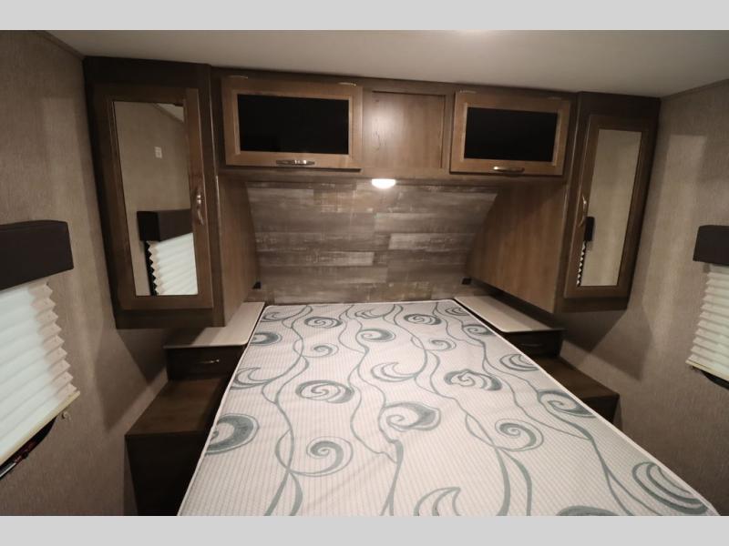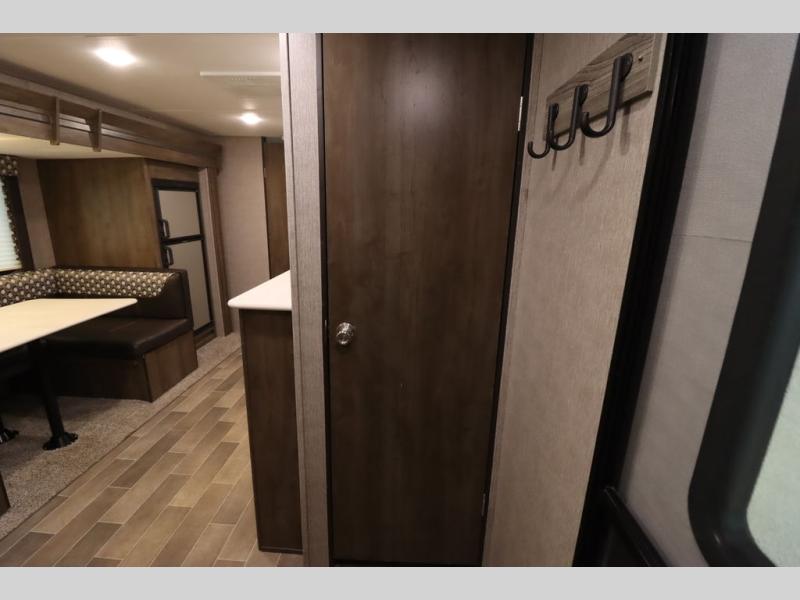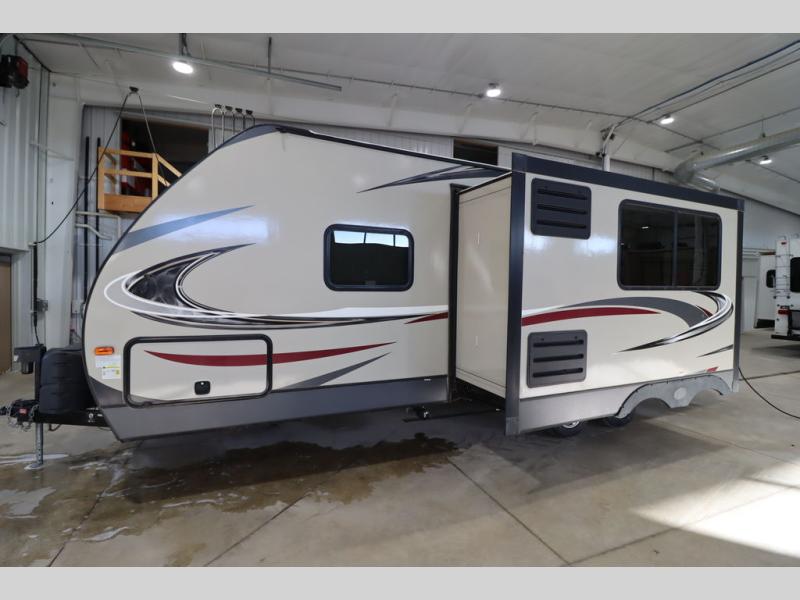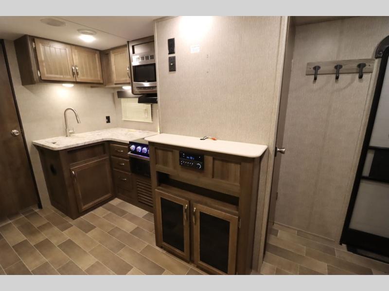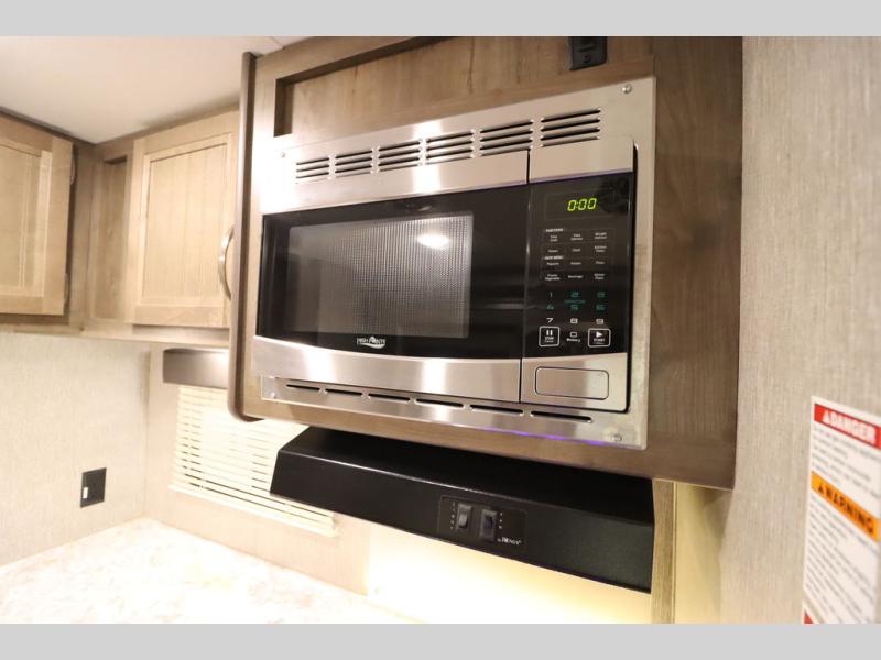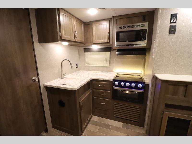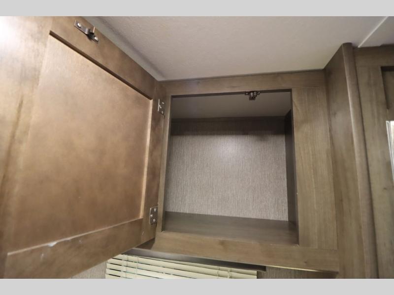 Step inside this travel trailer with a single slide for a fun and relaxing getaway with family. The U-shaped dinette is perfect for meal times and can also be used for additional sleeping space once folded down. You will enjoy the front private bedroom that features a queen Rest Easy mattress, and nightstands on both sides of the bed. This unit includes a three burner range to cook a meal just like you do at home, and plenty of counter space. As soon as you enter the trailer, you'll find a pantry and a walk-in closet with shelves that is perfect for shoes and jackets.