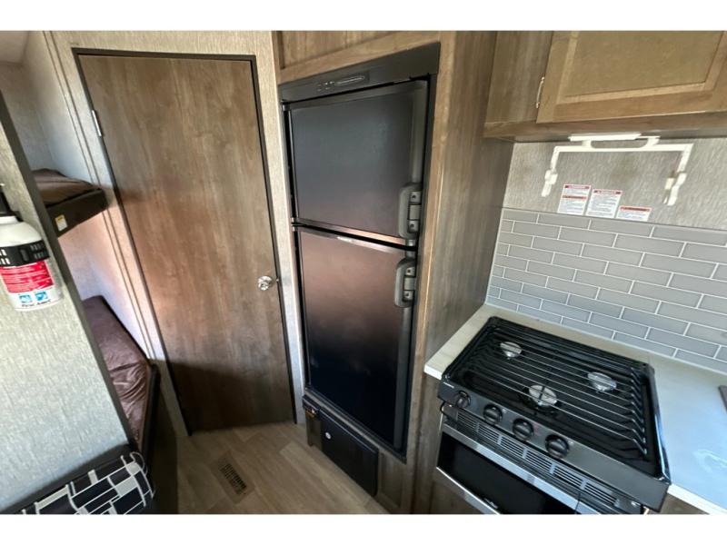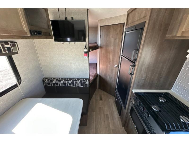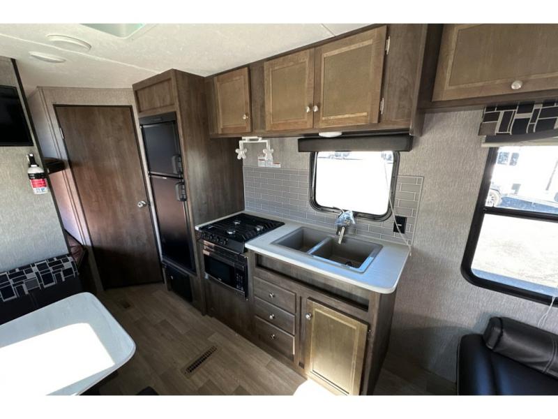 This single slide Coleman Lantern travel trailer offers sleeping accommodations for eight people when you fold down the 83" U-shaped dinette. The kids will love the double-size bunks so that they have room to spread out, and you will appreciate having your own queen bed with USB connections on the opposite end of the trailer. If friends tag along, the U-shaped dinette can be theirs at night, and the chef will have the choice of cooking inside with full kitchen amenities or outside at the outdoor kitchen while watching the kids play. Load up the family and start making memories today!
