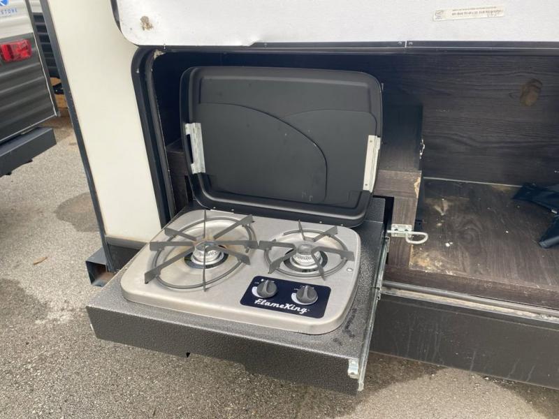 With its all-inclusive amenities and large sleeping capacity, this travel trailer redefines extravagance. Because this unit comes with a rear private bunkhouse with triple bunks, it can be used as a guest room for friends or as a play room for your kids when the rain won't seem to stop. The living area is a wonderful place for everyone to gather together because of the extra floor space that the single slide adds to this trailer. You will love having the ability to prepare your meals in the outdoor kitchen when the weather is nice, and when it is time to clean up, you can store leftovers securely in the six cubic foot double door refrigerator in the full kitchen. Take a look, you will be happy you did!